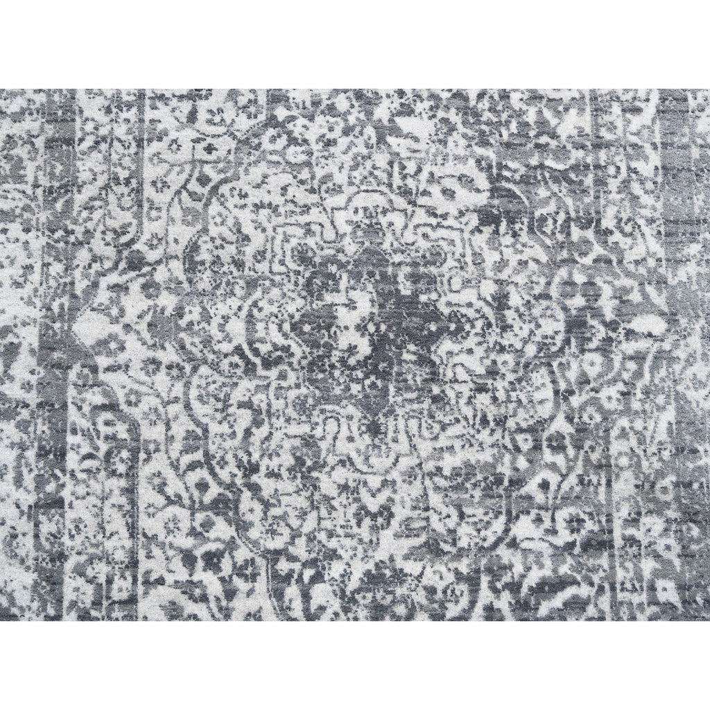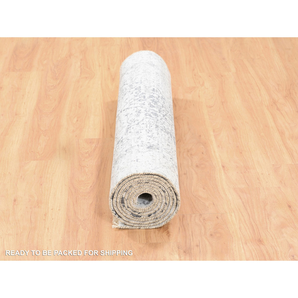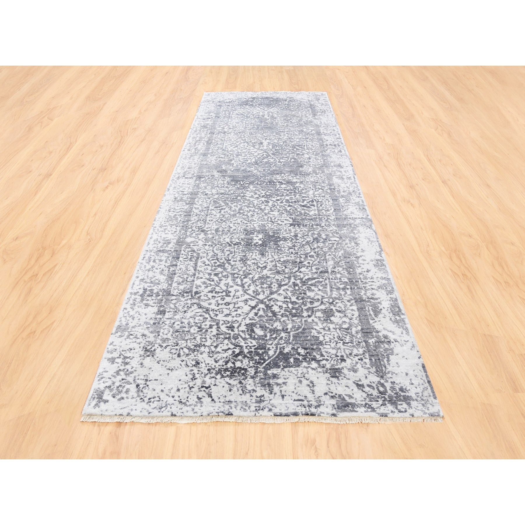 4'1"x12'1" Grey Wool And Pure Silk Broken Persian Design Hand Knotted Oriental Wide Gallery Size Runner Rug FWR374202