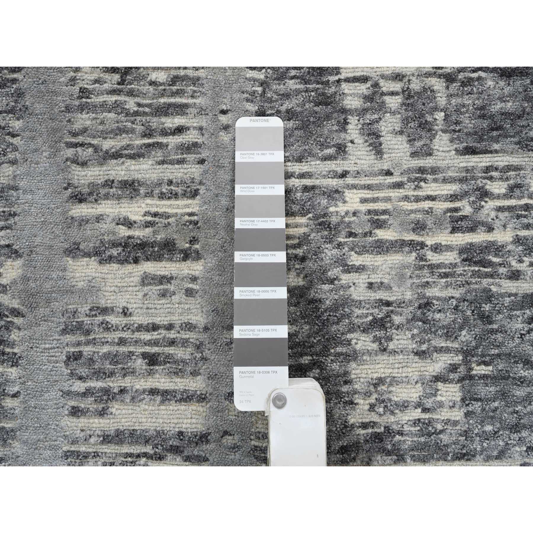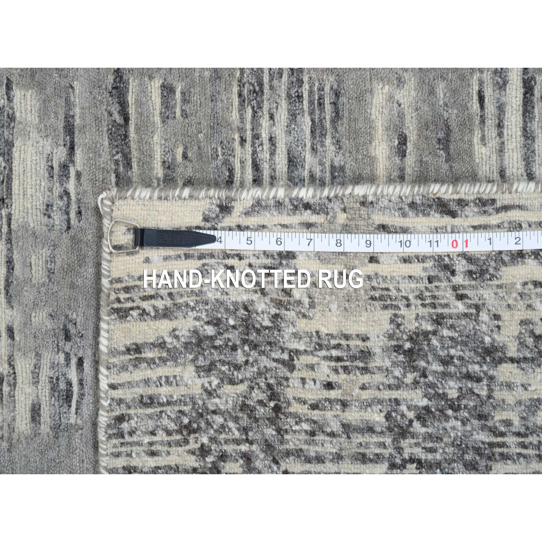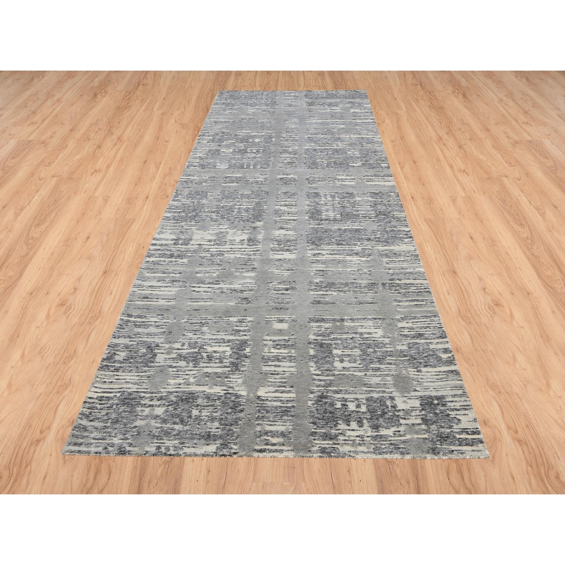 4'1"x12' Light Gray Hand Spun Undyed Natural Wool Modern Criss Cross Erased Design Hand Knotted Wide Runner Oriental Rug FWR384936