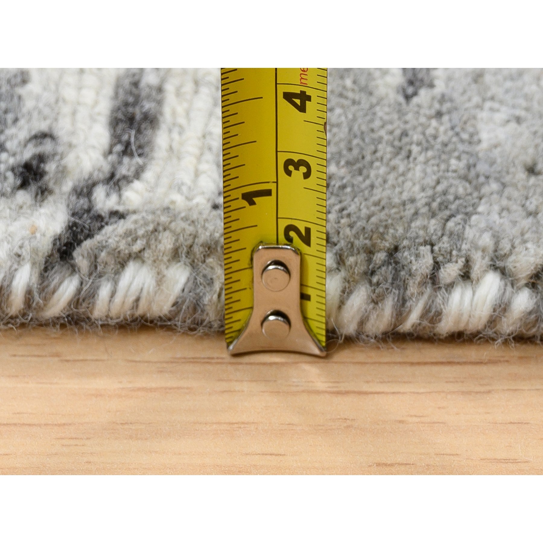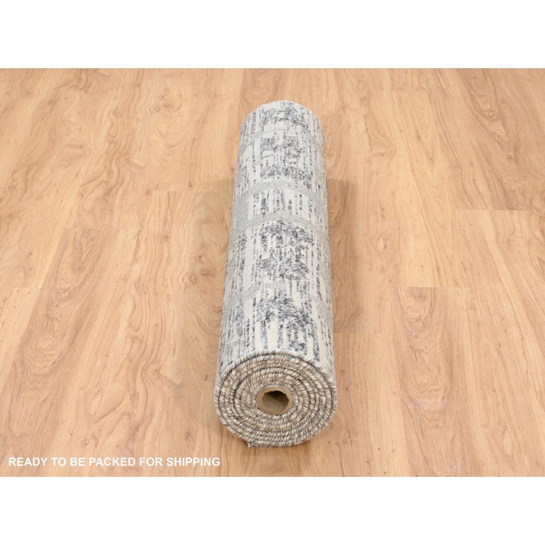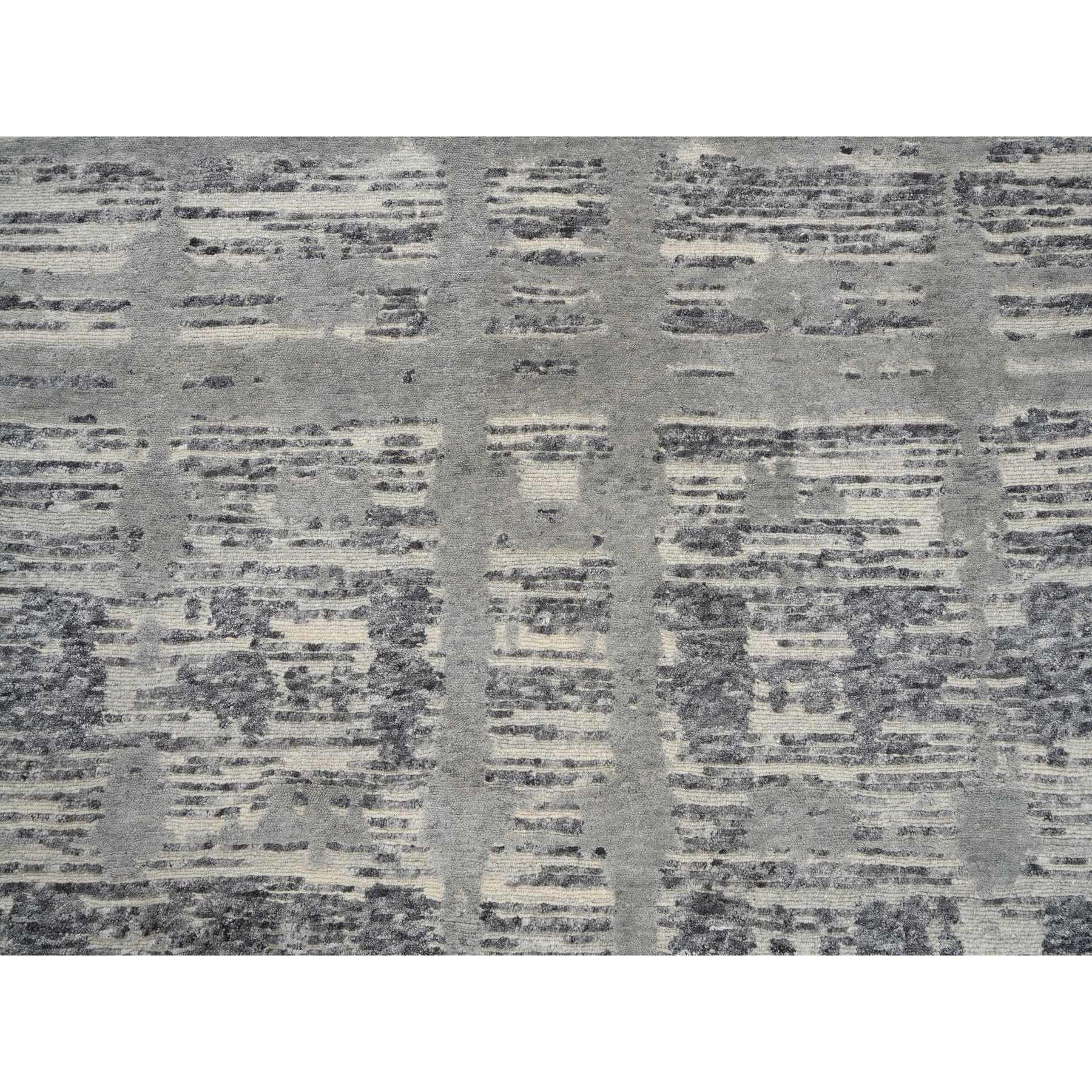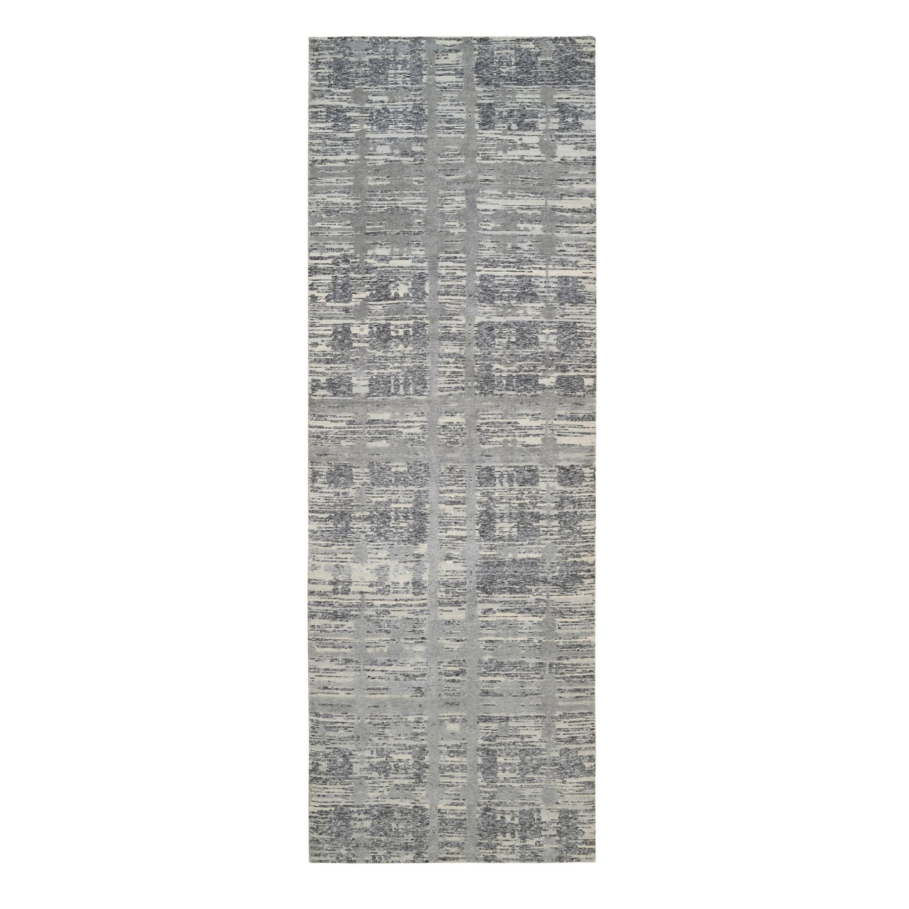 4'1"x12' Light Gray Hand Spun Undyed Natural Wool Modern Criss Cross Erased Design Hand Knotted Wide Runner Oriental Rug FWR384936
