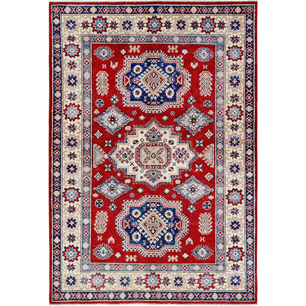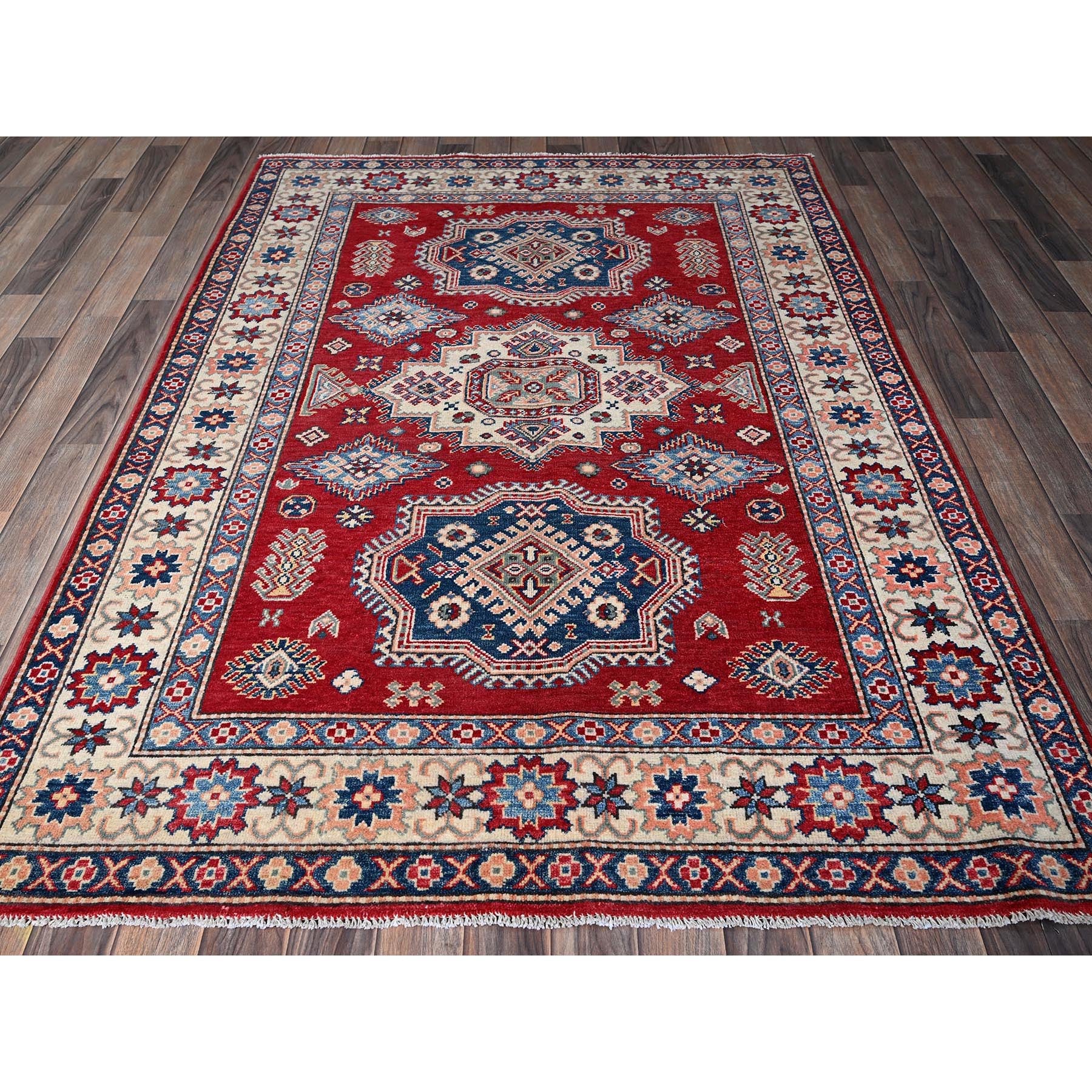 4'10"x7' Scarlet Red, Kazak With Geometric Medallions Design, Vegetable Dyes, Hand Knotted, Denser Weave, Pure Wool, Oriental Rug FWR1980