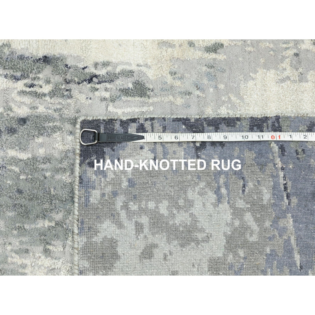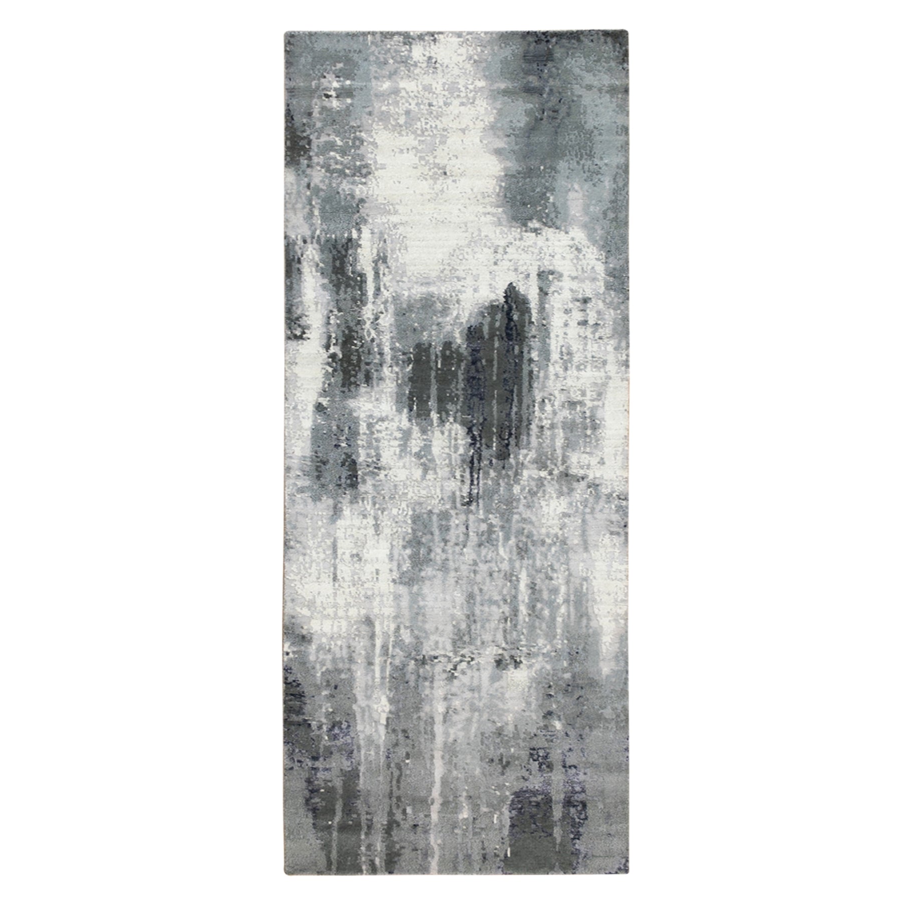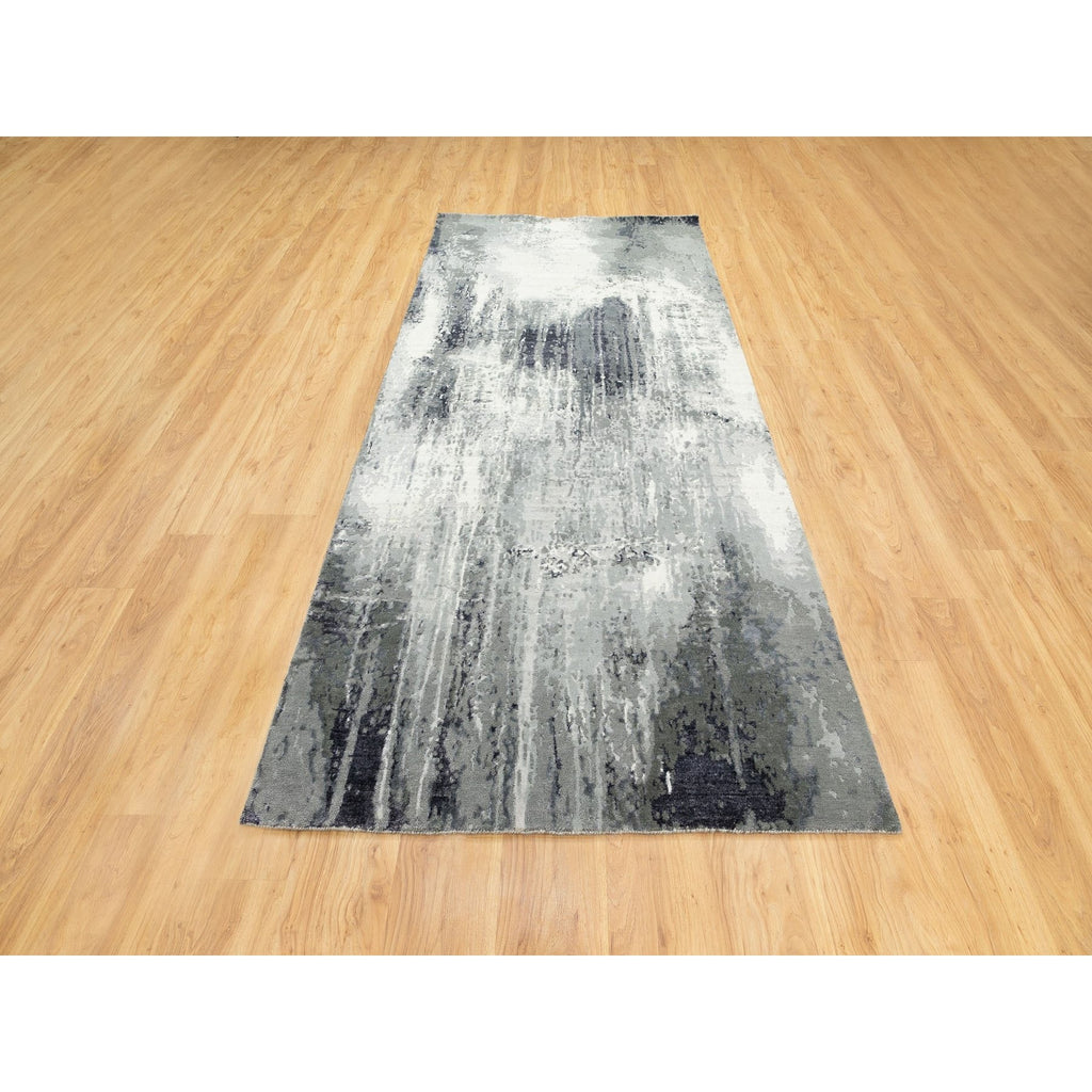4'3"x10' Gray With Charcoal Black Hand Knotted Abstract Design Wool And Silk Oriental Runner Rug FWR372144