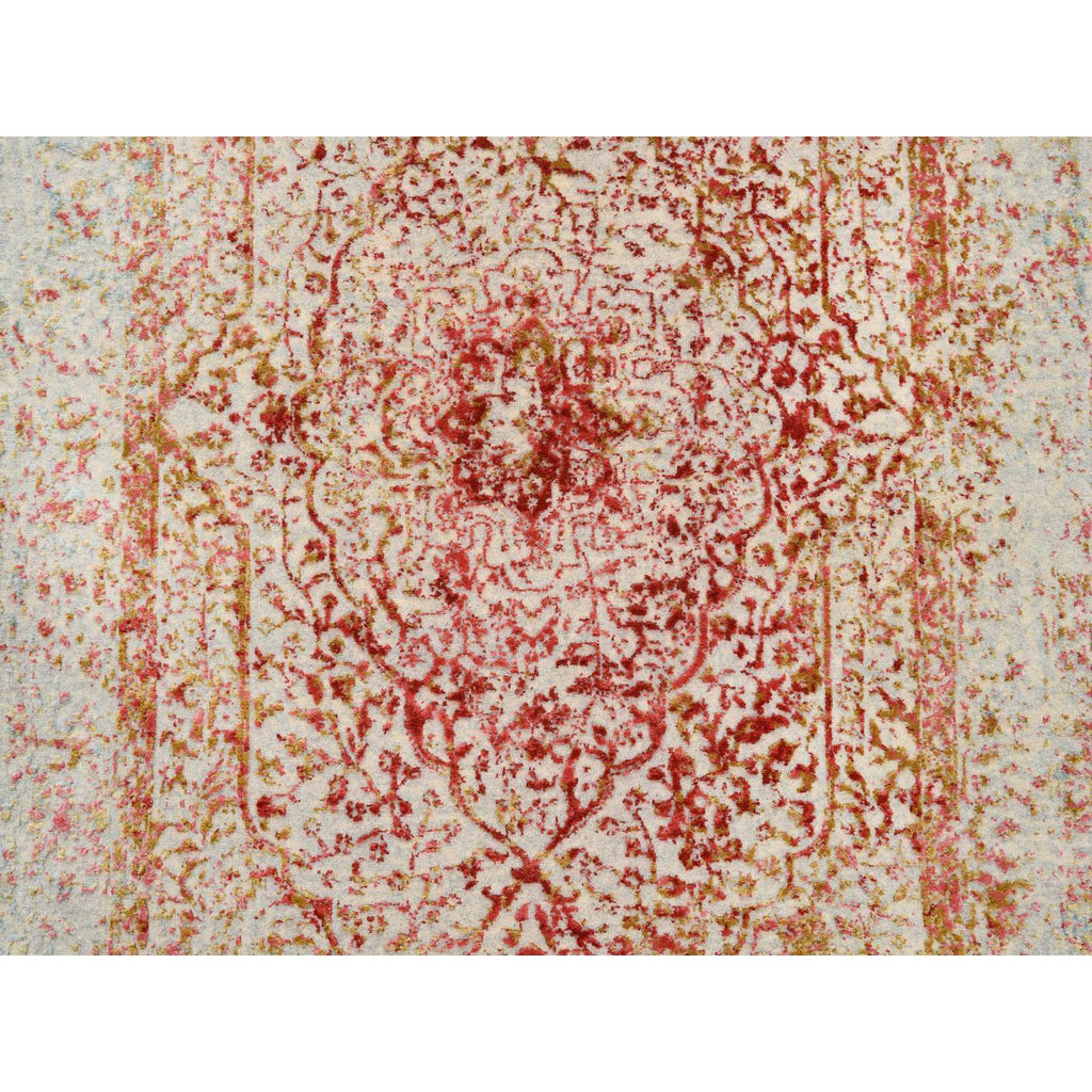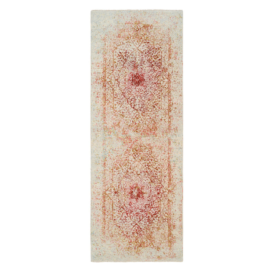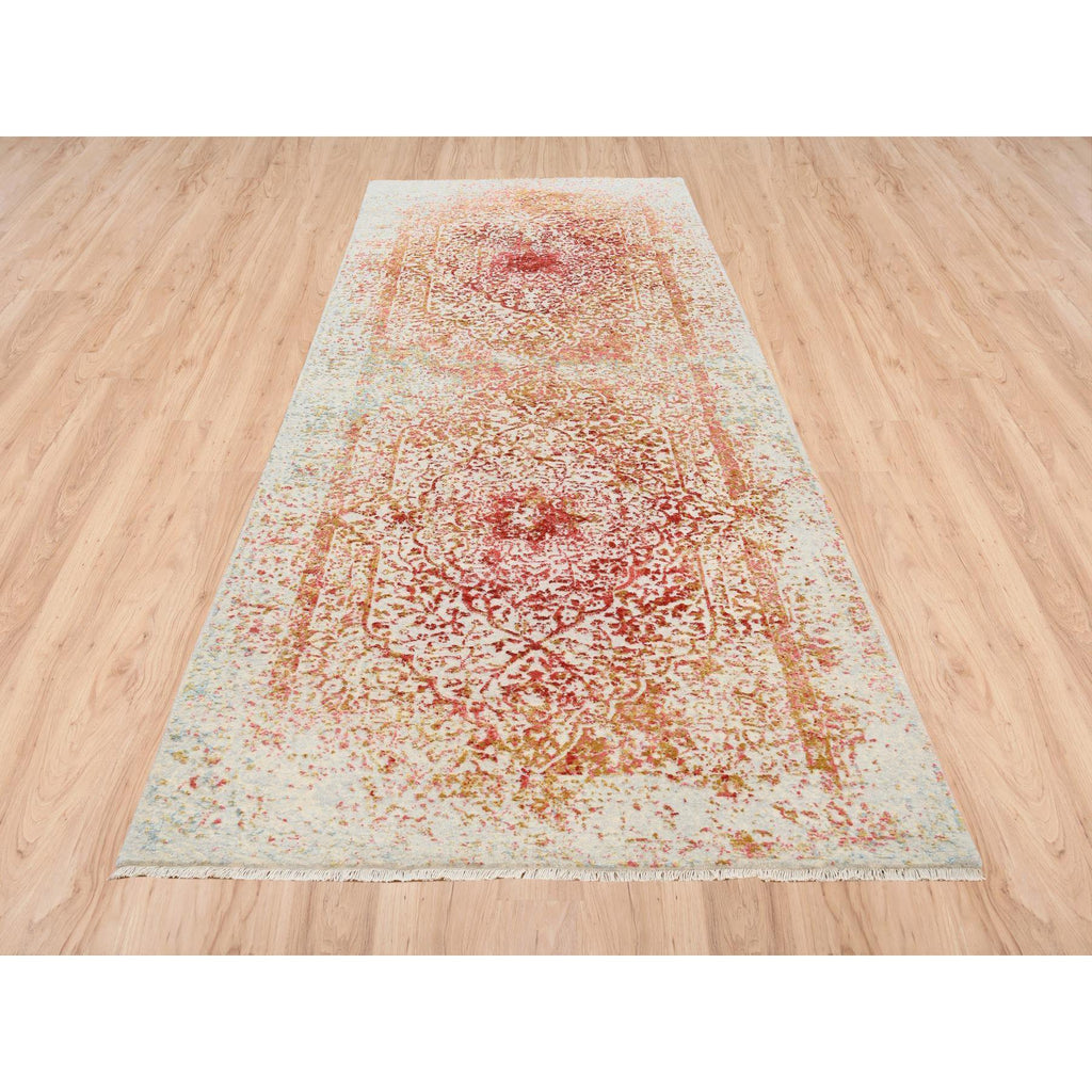 4'x11'9" Hand Knotted Pink Persian Erased Medallion Design Wool And Pure Silk Oriental Wide Runner Rug FWR380796