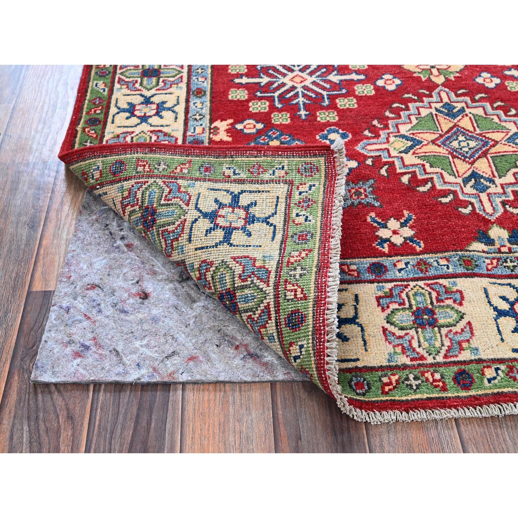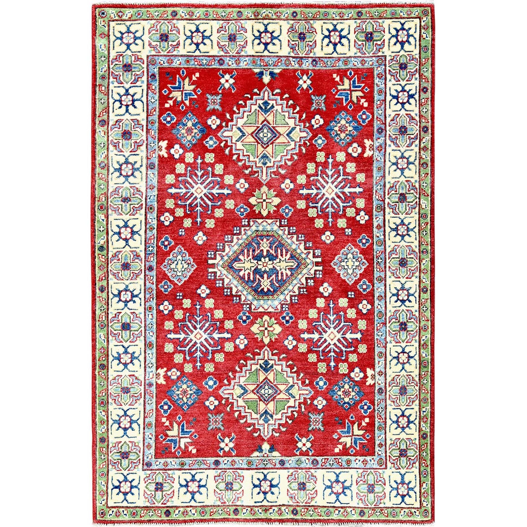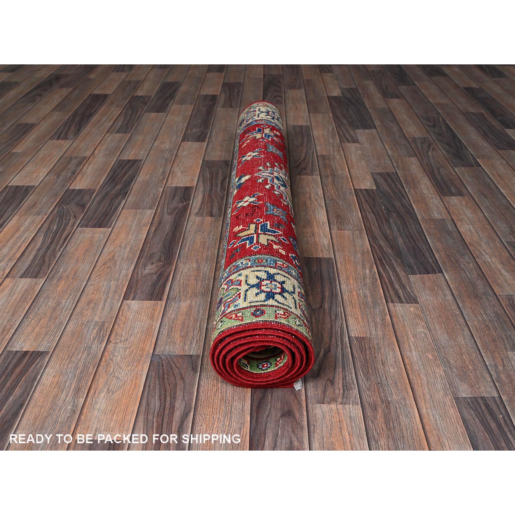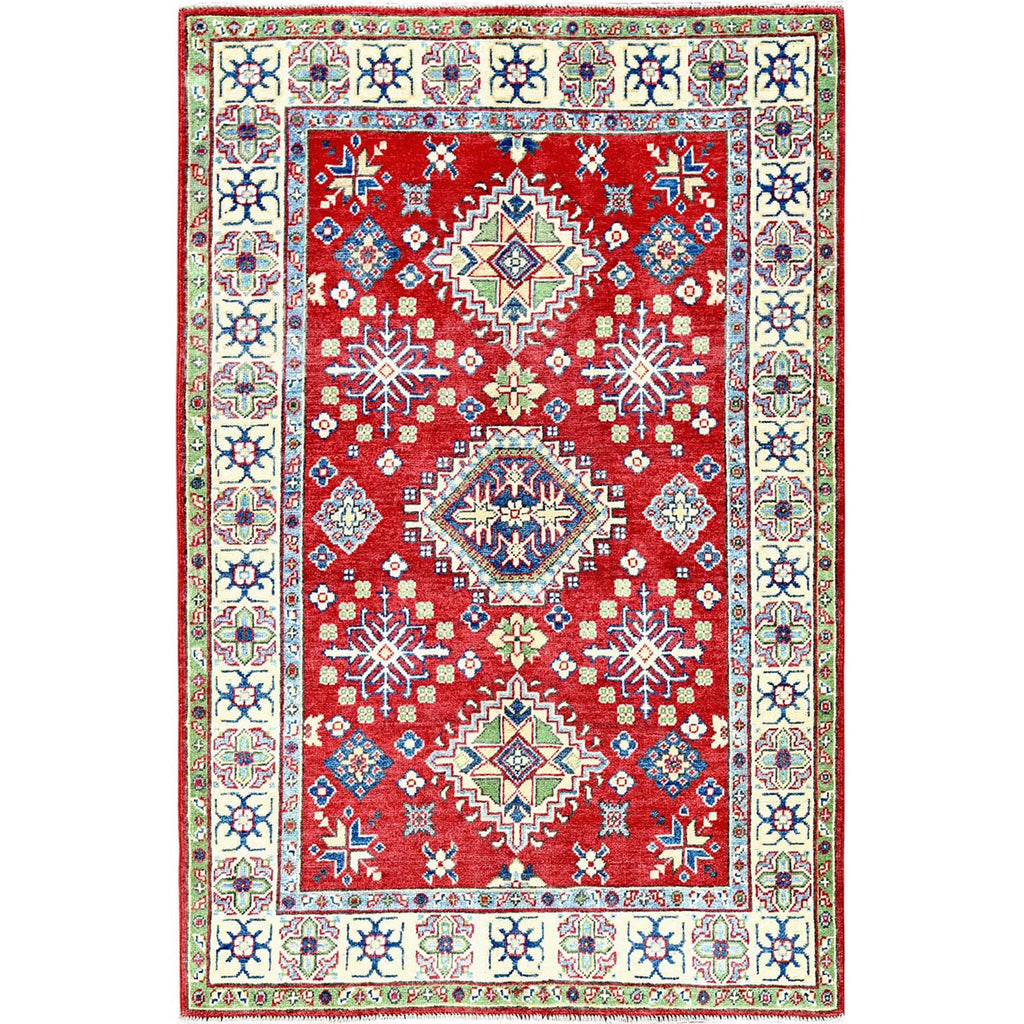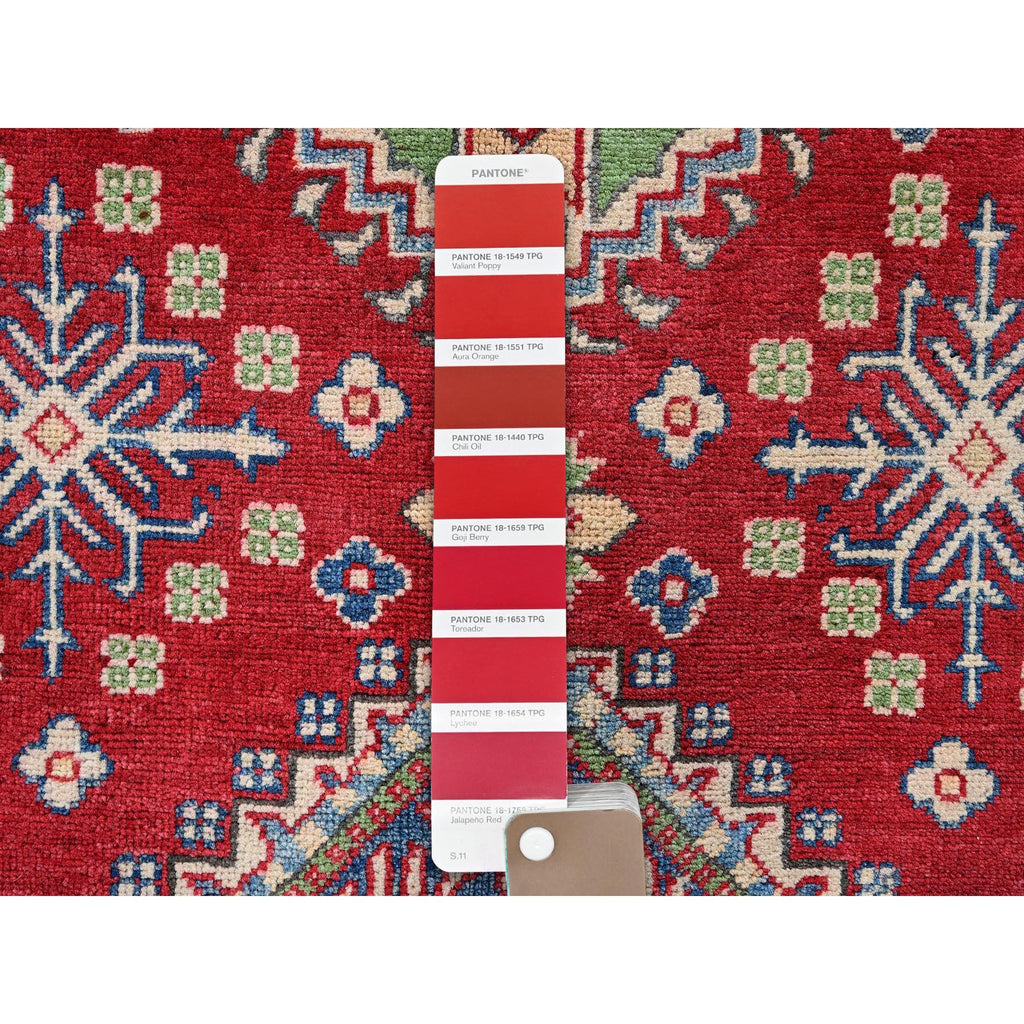4'x6' Crimson Red, Kazak With All Over Tribal Motifs, Vegetable Dyes, Hand Knotted, Denser Weave, Pure Wool, Oriental Rug FWR2148