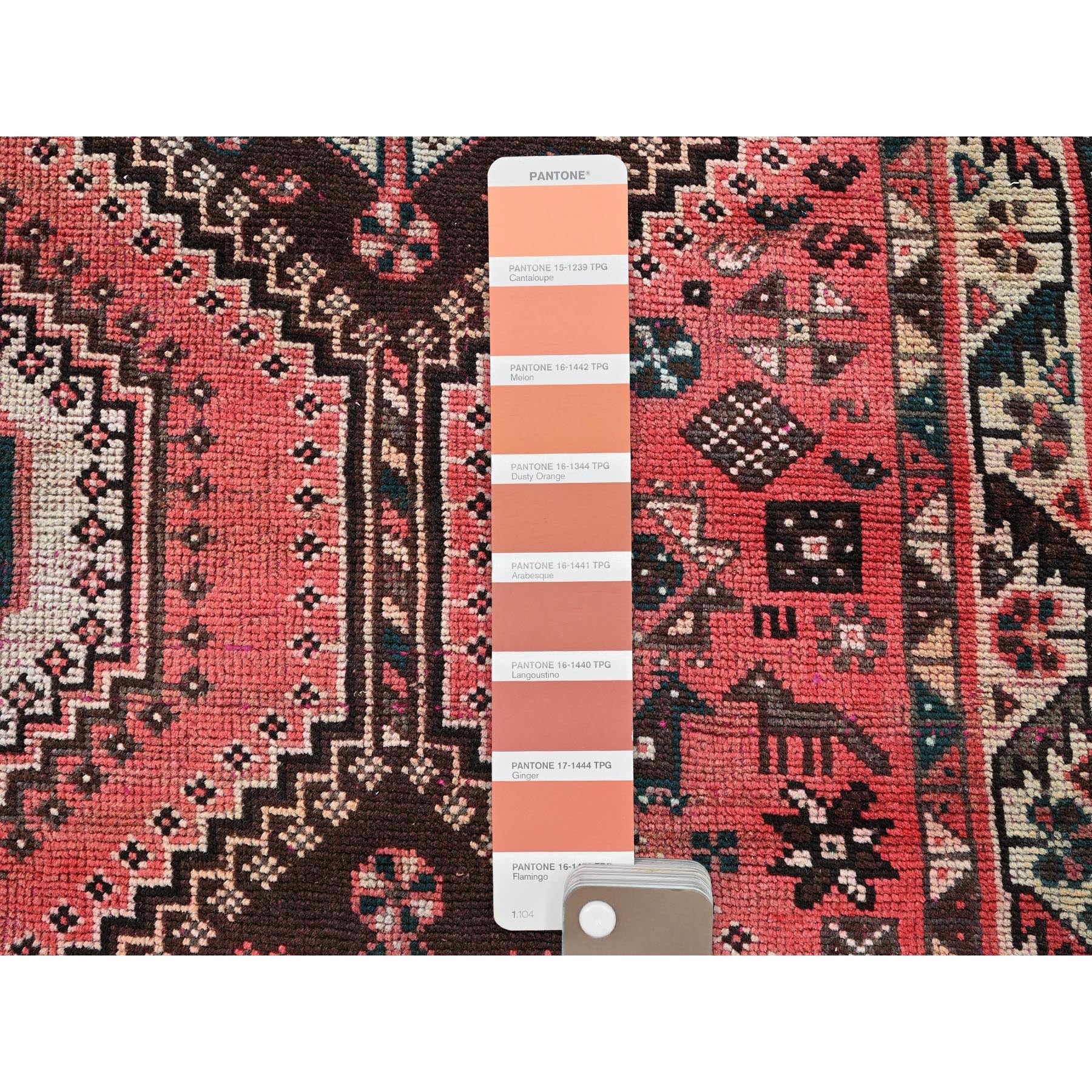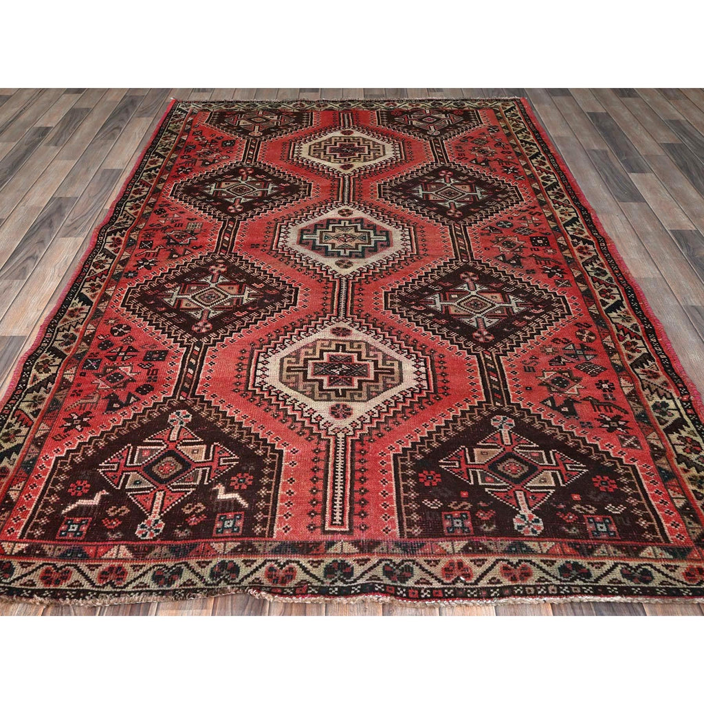 5'2"x7'10" Blush Red, Vintage Persian Shiraz With Geometric Pattern, Small Animal Figurines, Shaved Low, Zero Pile, Sides And Ends Professionally Secured, Clean, Hand Knotted, Pure Wool, Oriental Rug FWR4878