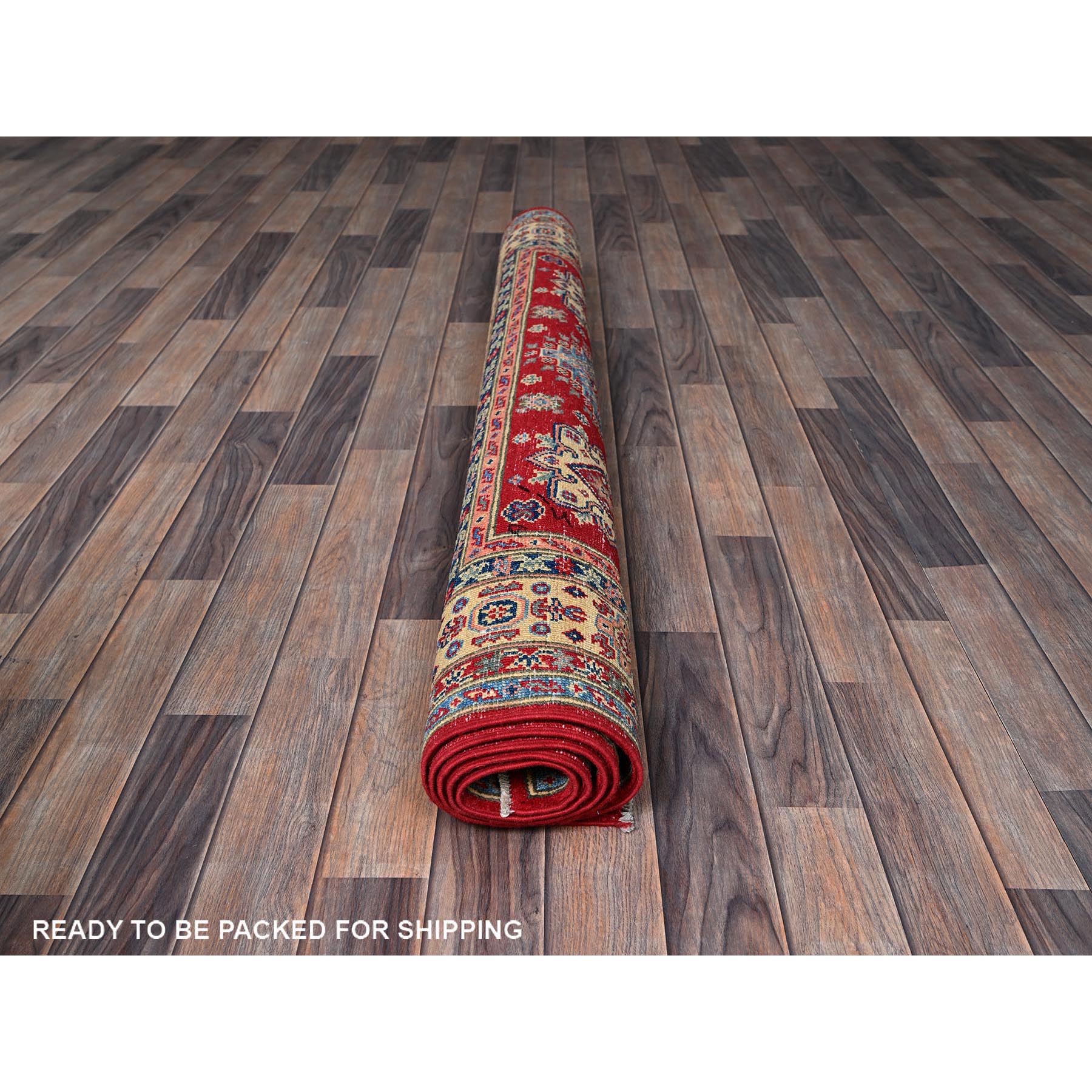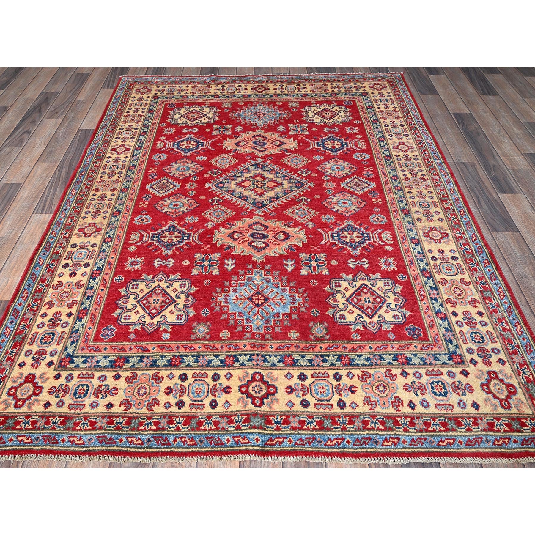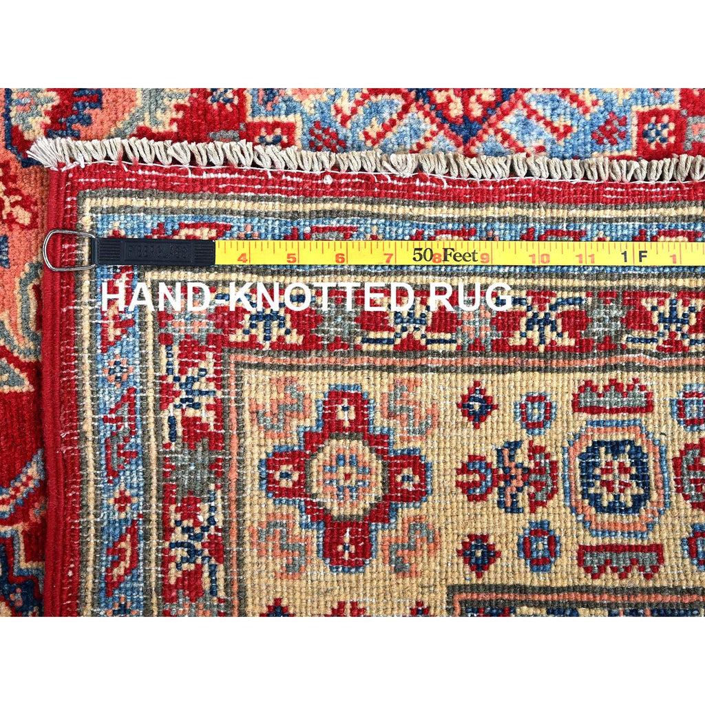 5'x6'4" Scarlet Red, Kazak With Geometric Medallions Design, Vegetable Dyes, Hand Knotted, Denser Weave, Pure Wool, Oriental Rug FWR2028
