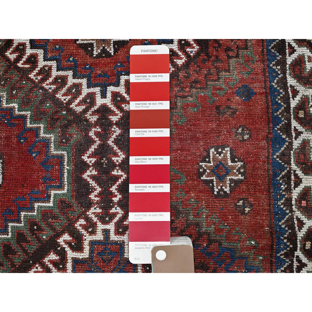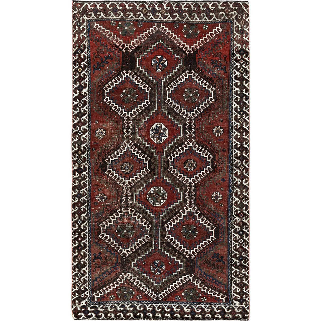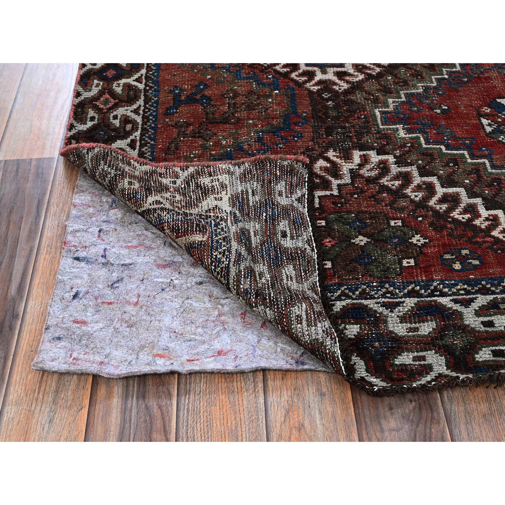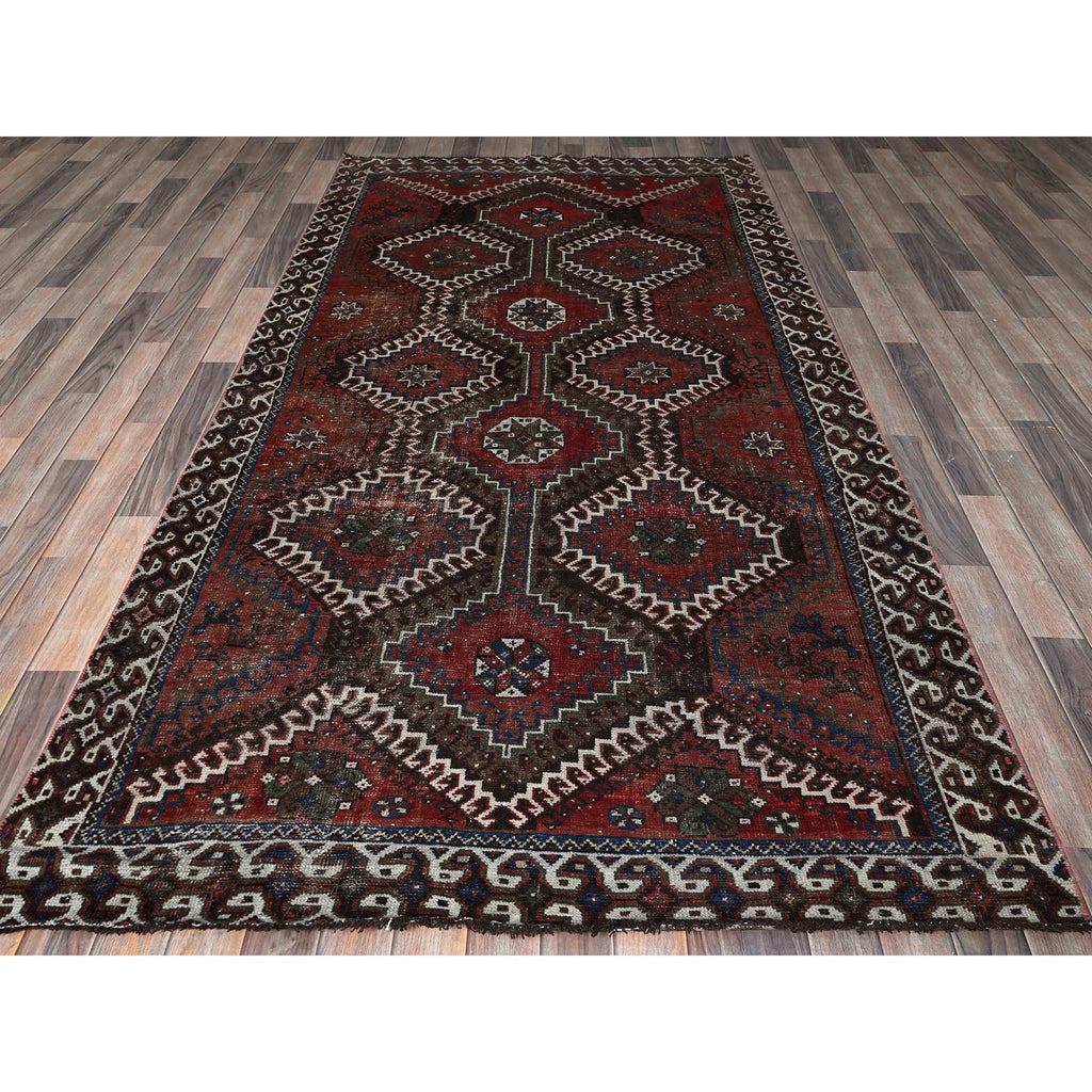 5'x9'2" Brick Red, Vintage Persian Shiraz With Geometric Design, Worn And Distressed, Sheared Low, Zero Pile, Sides And Ends Professionally Secured, Hand Knotted, Pure Wool, Wide Runner, Oriental Rug FWR4830