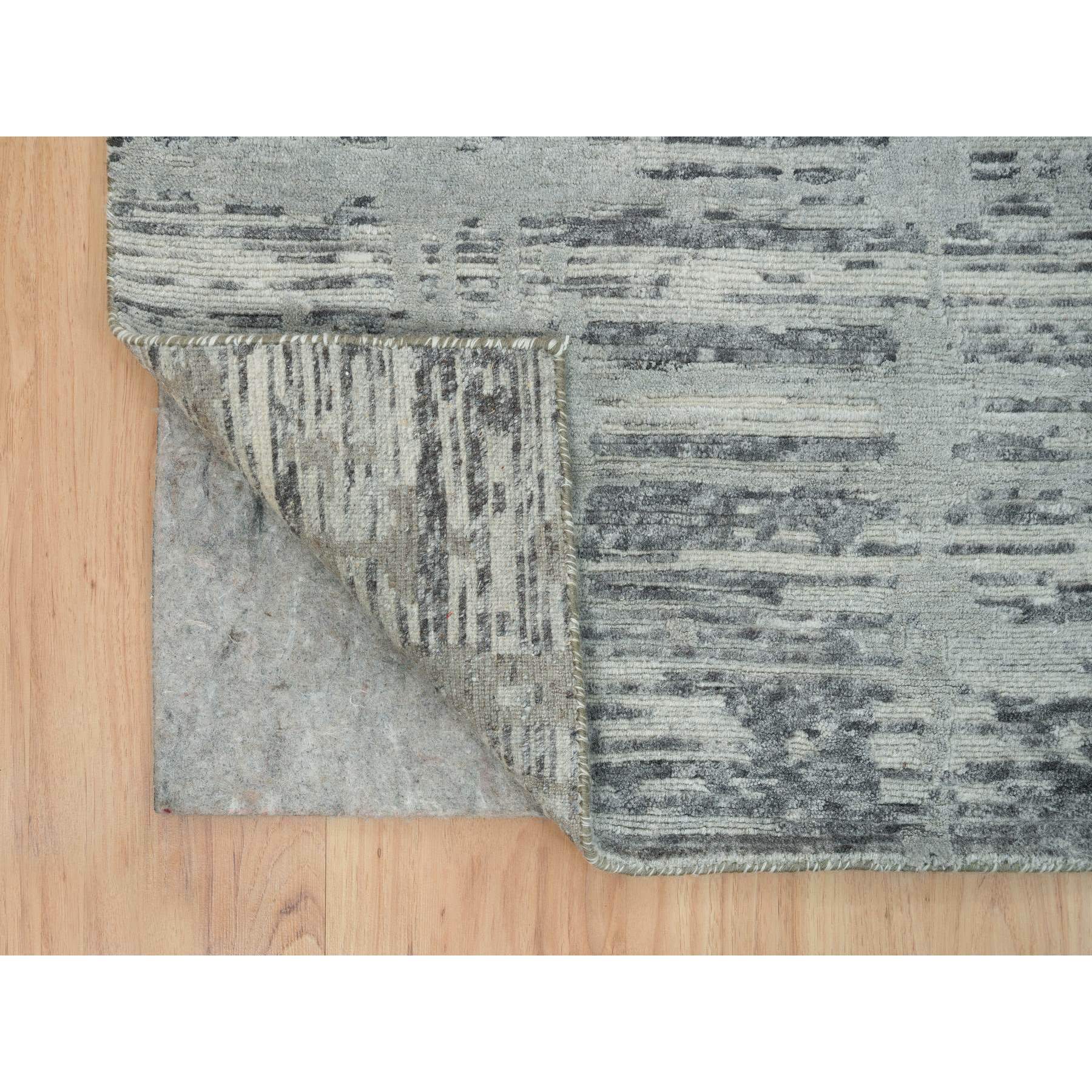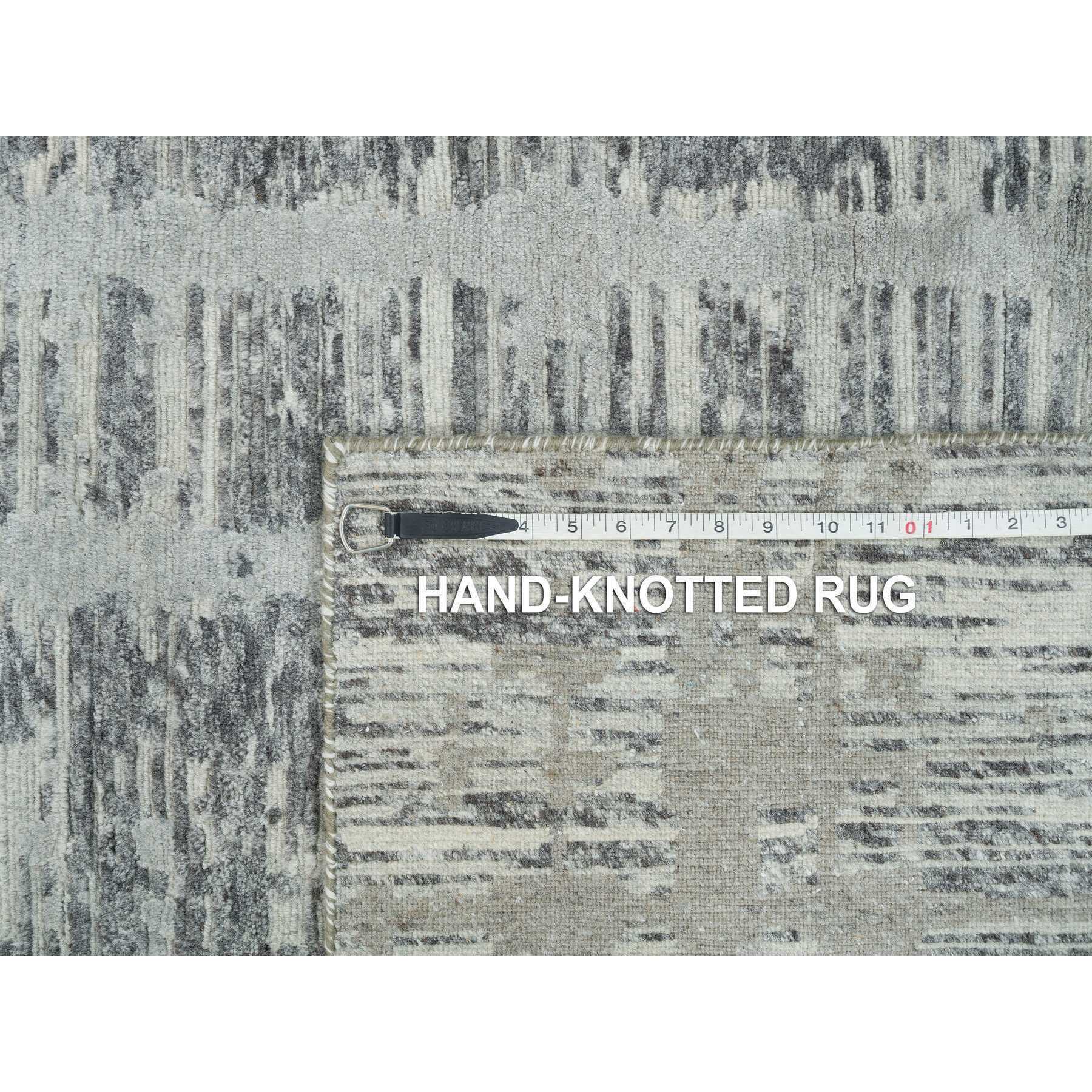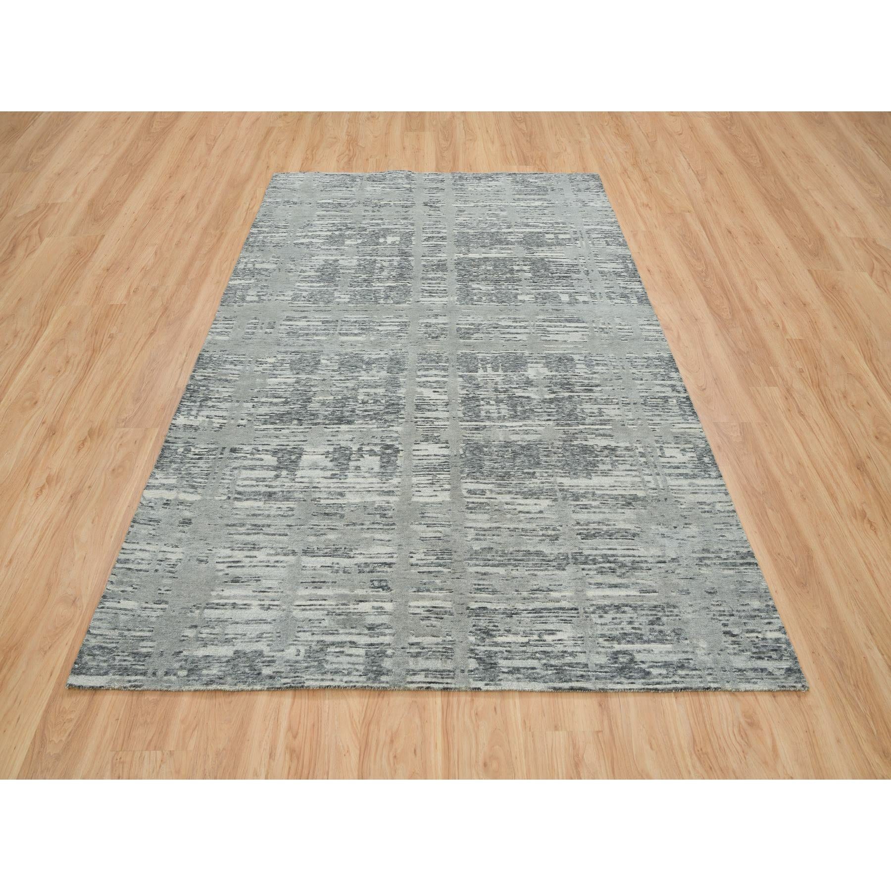 6'1"x9'2" Dark Grey, Hand Knotted, Modern Criss Cross Erased Design, Hand Spun Undyed Natural Wool, Oriental Rug FWR393858