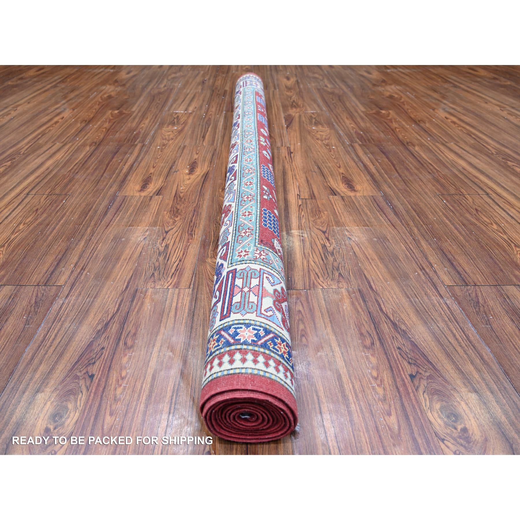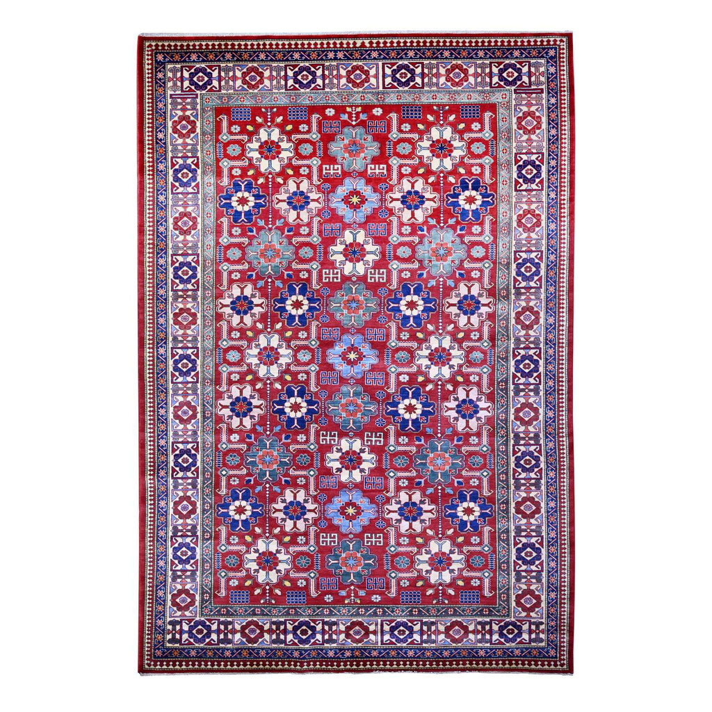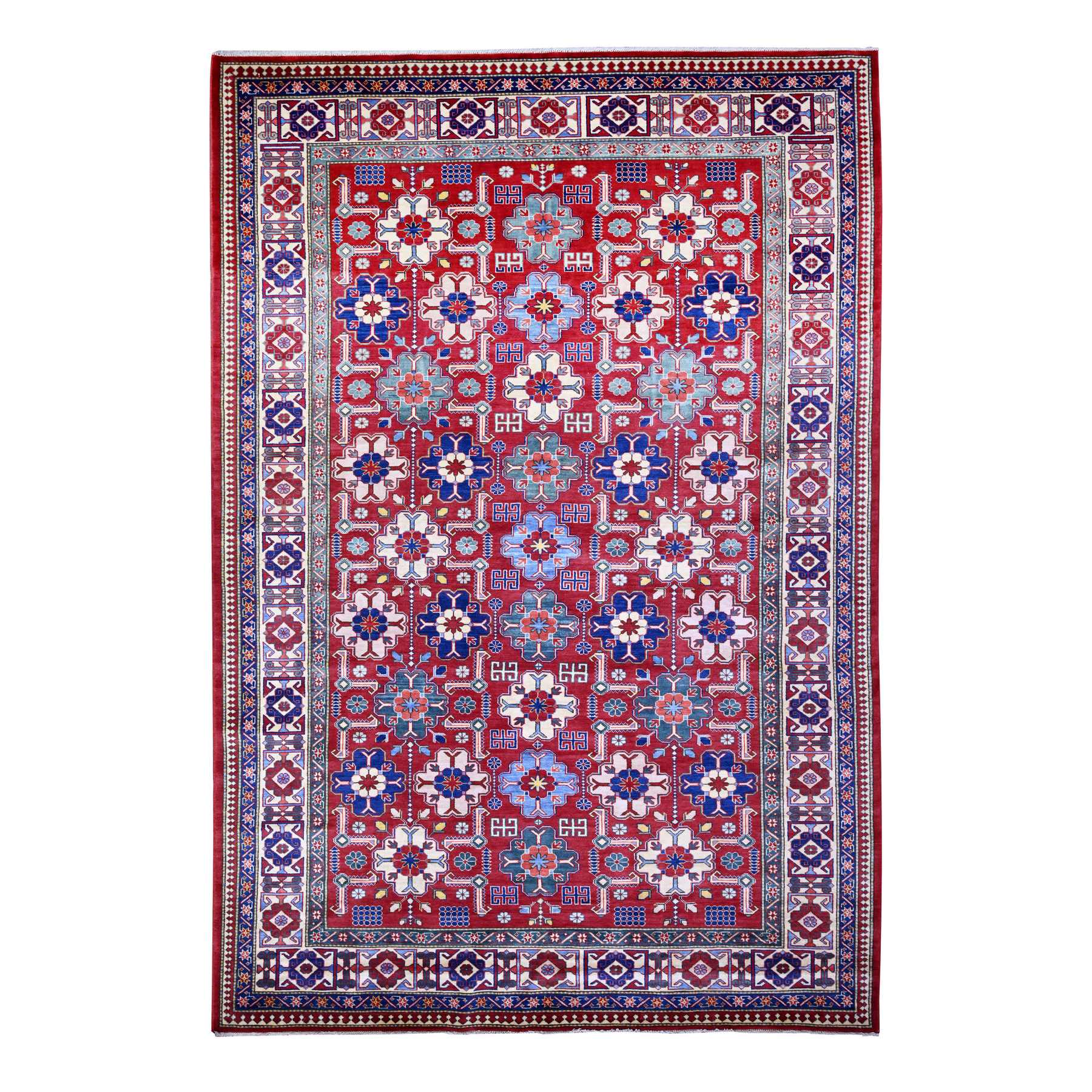 6'4"x9'4" Vermilion Red, Caucasian Design, Vegetable Dyes, 100% Wool, Afghan Super Kazak With Shirvan Repetitive Geometrical Rosette, Hand Knotted, Oriental Rug FWR449004