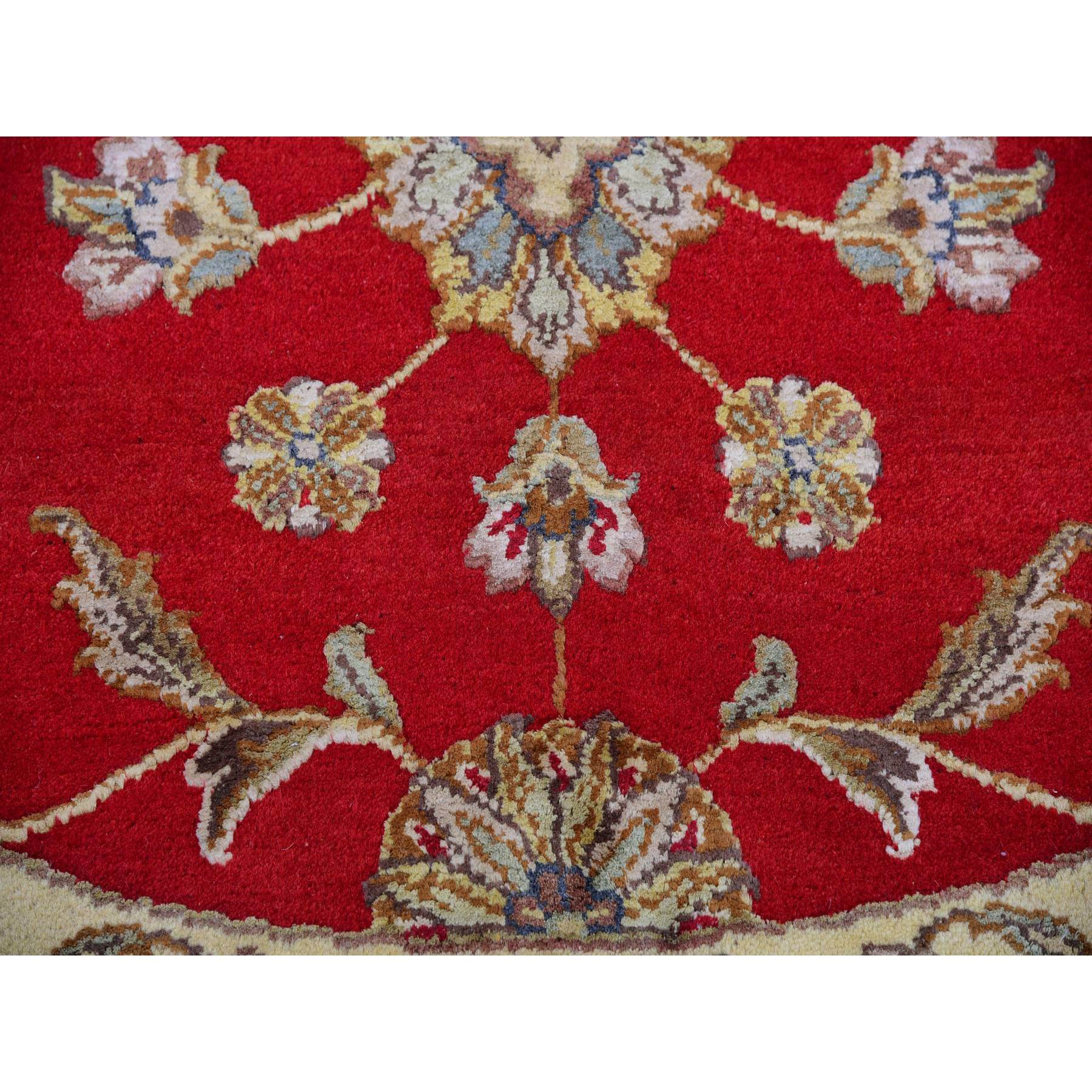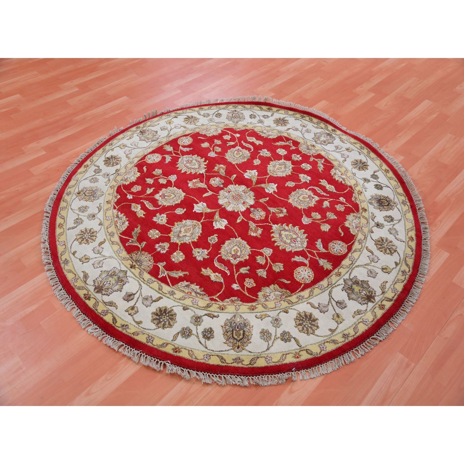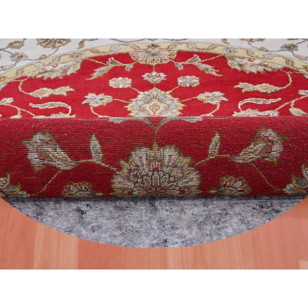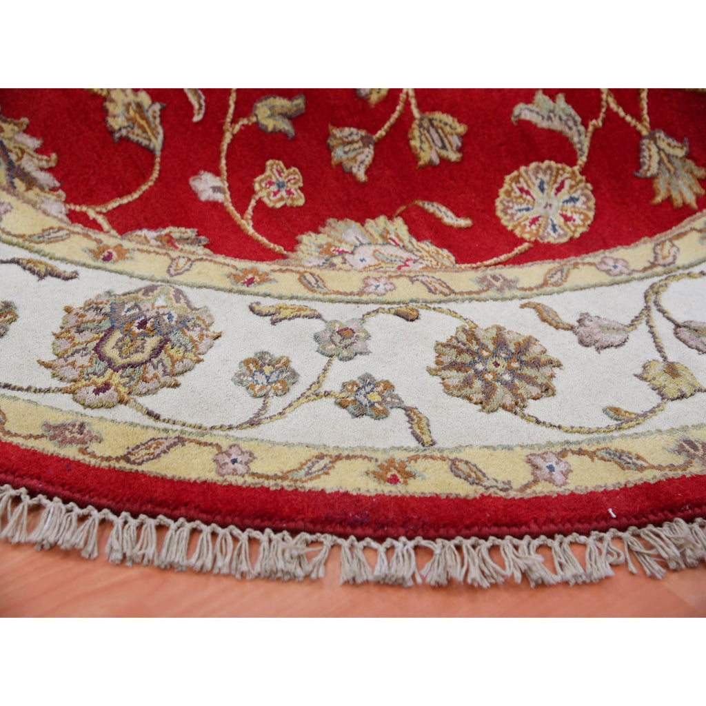 6'x6' Caliente Red With Cloud White, Rajasthan Design All Over Pattern, Hand Knotted Thick And Plush, Wool And Silk, Round Oriental Rug FWR452172