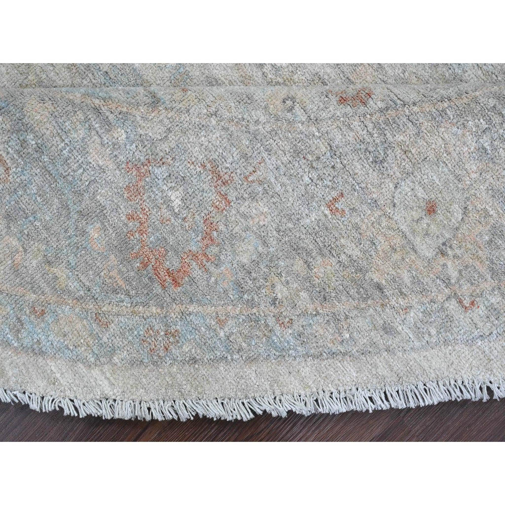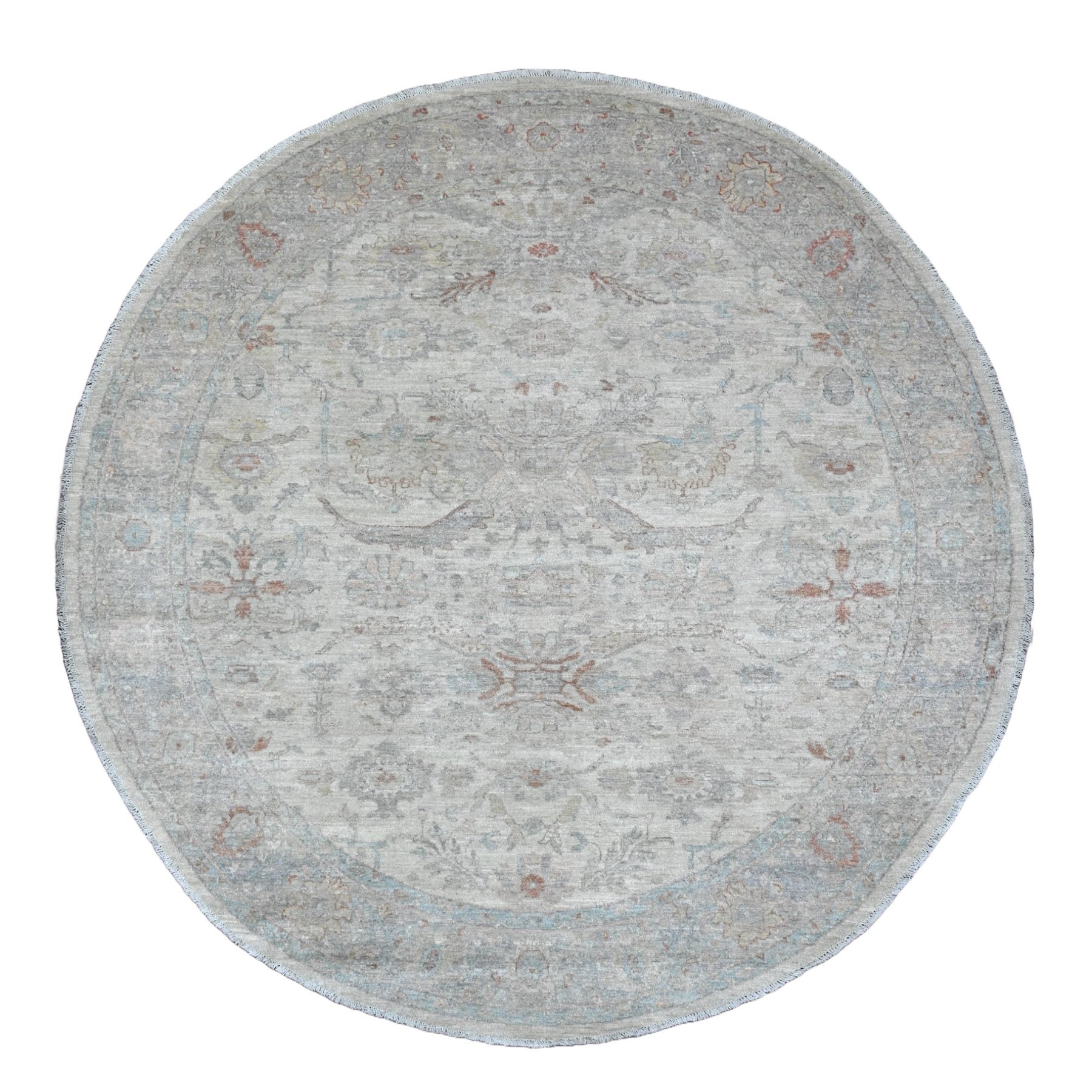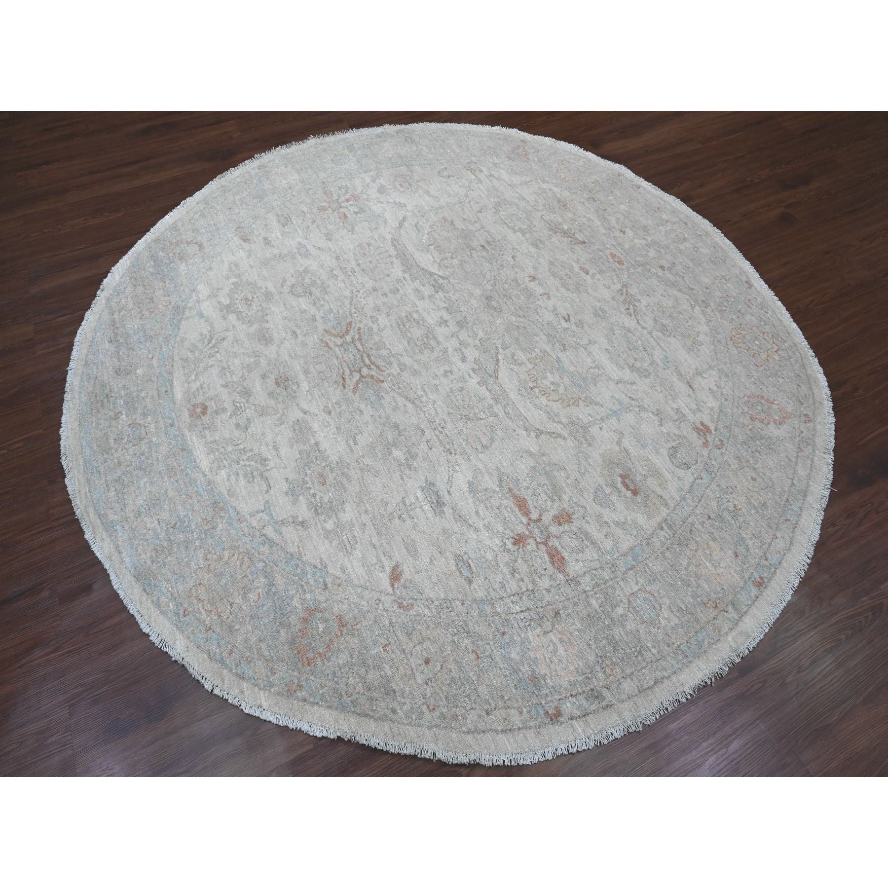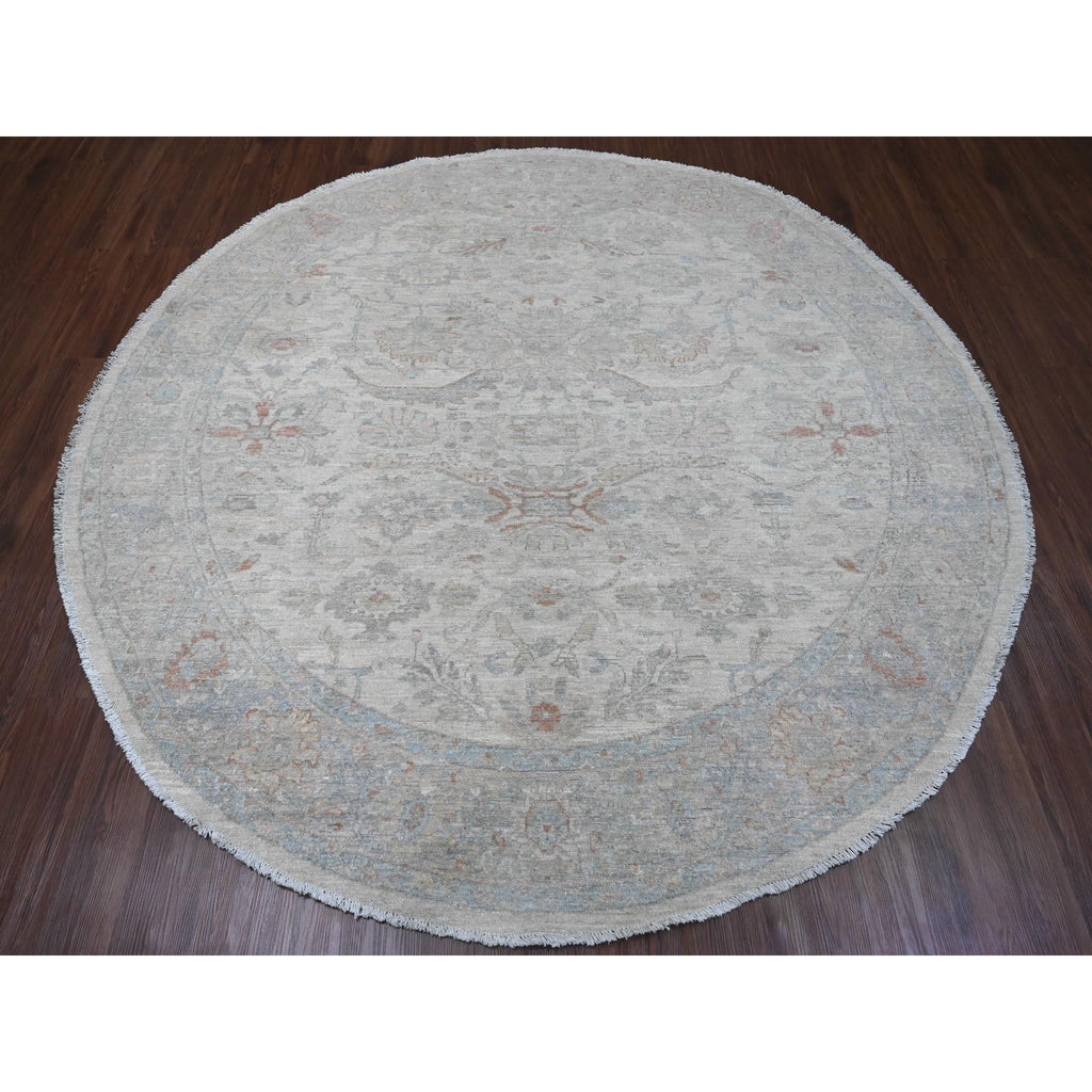 7'9"x7'9" Cascading White, Washed Out Peshawar With Heriz All Over Design, High Mountain Wool, Densely Woven, Hand Knotted, Round, Oriental Rug FWR538776