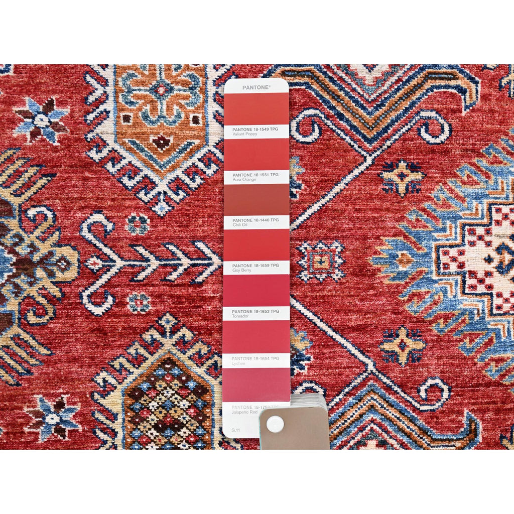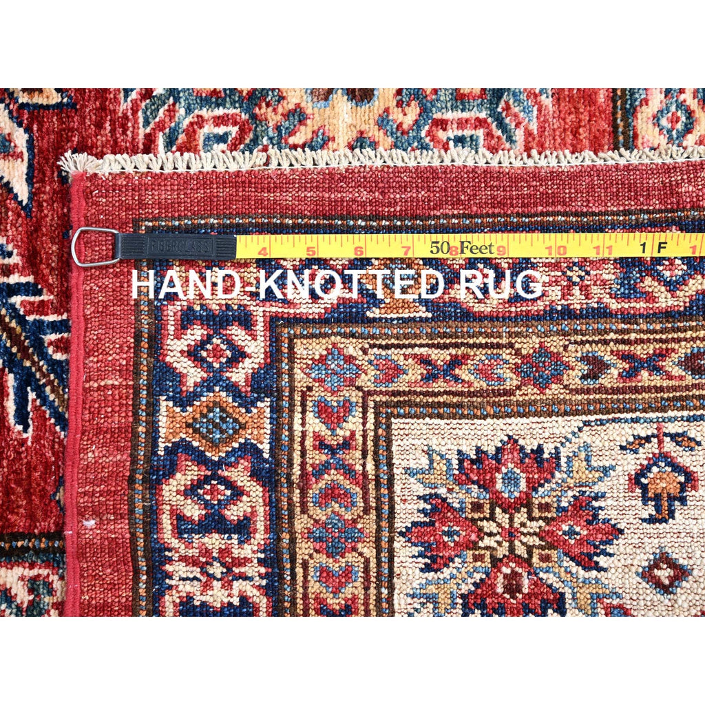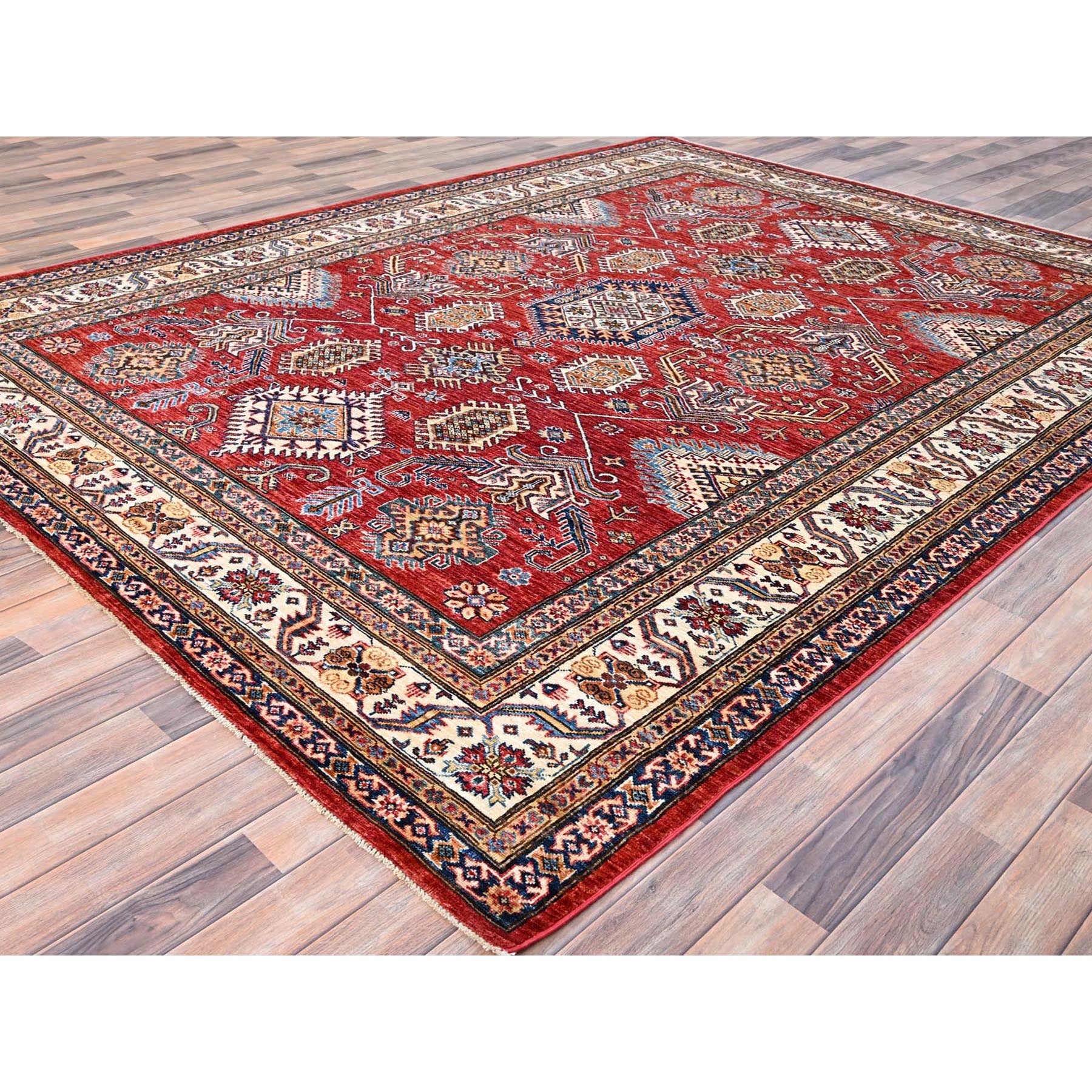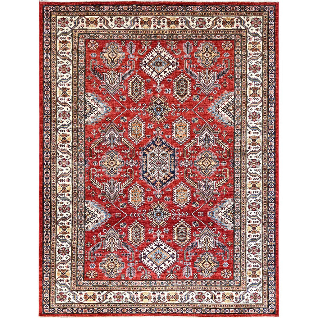 8'1"x10'6" Rich Red, Dense Weave, Vegetable Dyes, 100% Wool, Afghan Super Kazak With Geometric Elements, Hand Knotted, Oriental Rug FWR514710