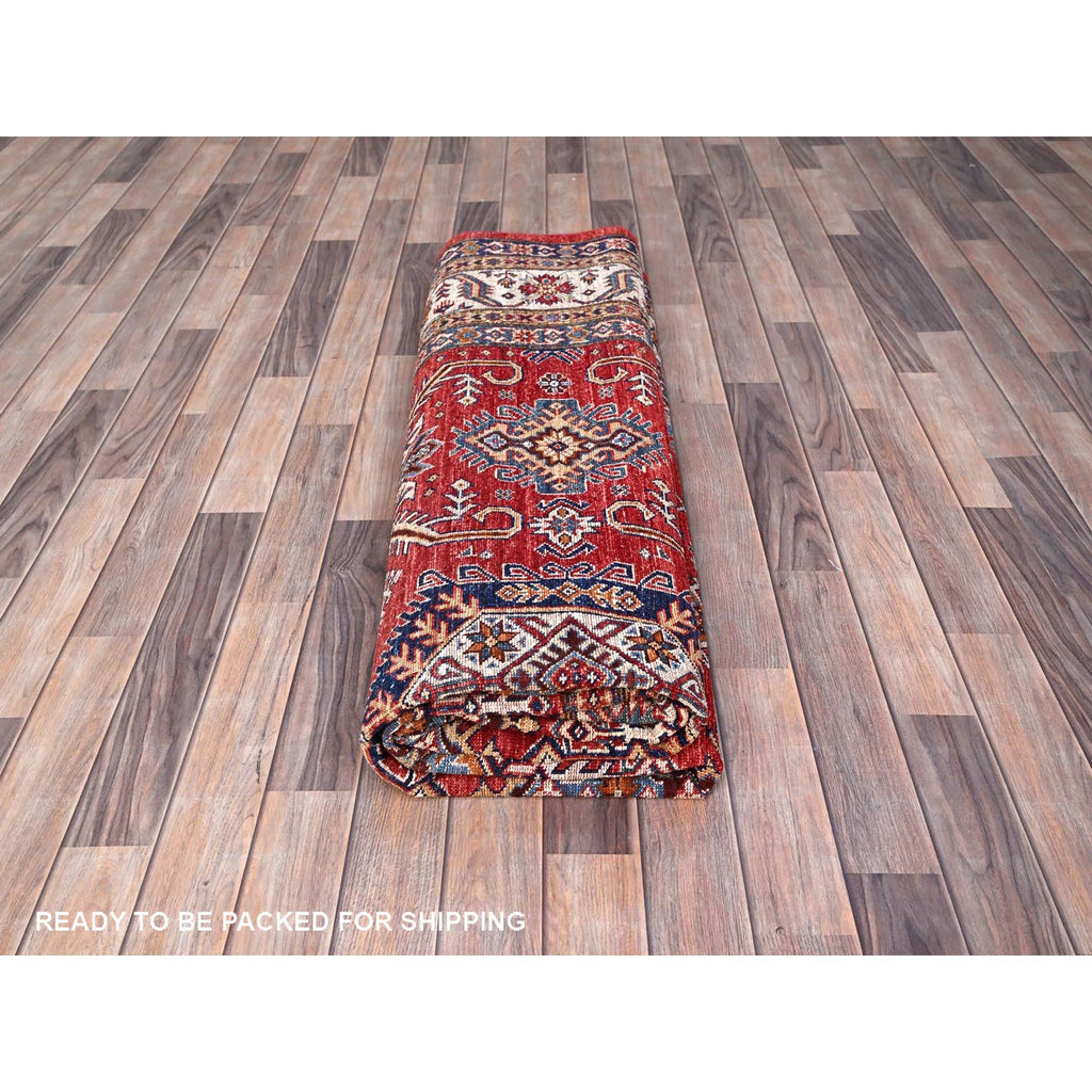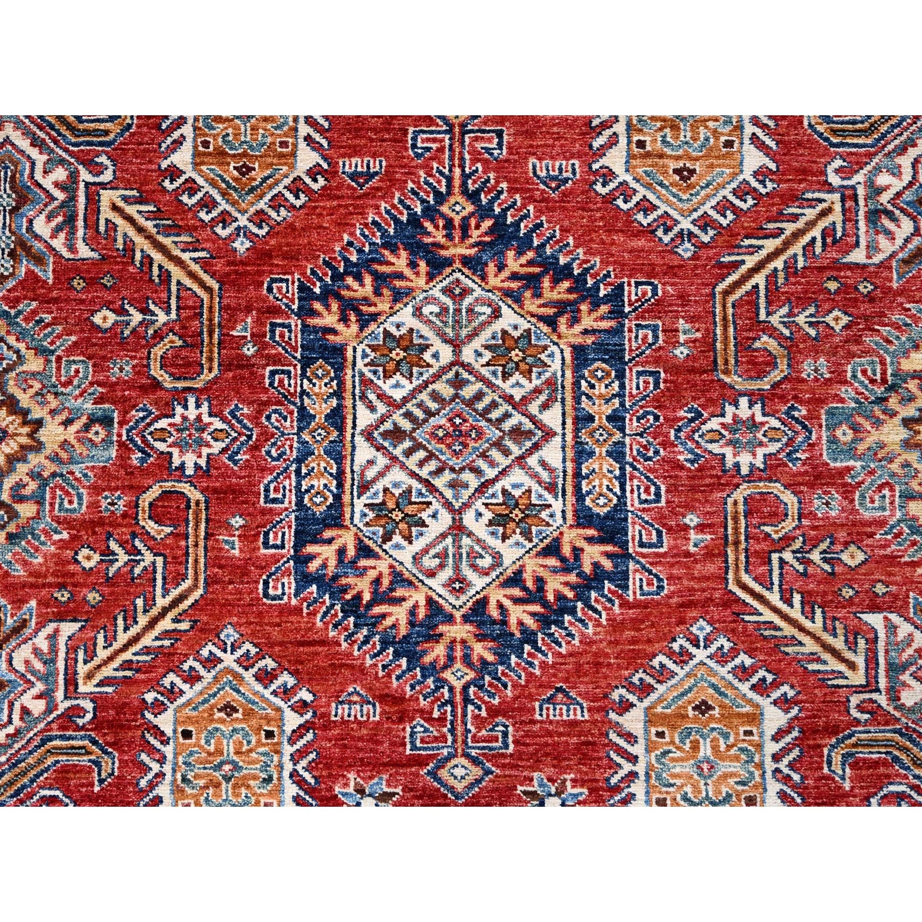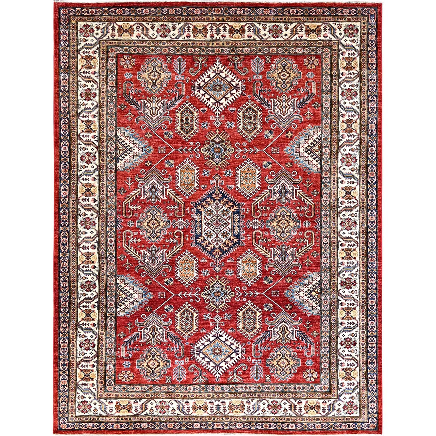 8'1"x10'6" Rich Red, Dense Weave, Vegetable Dyes, 100% Wool, Afghan Super Kazak With Geometric Elements, Hand Knotted, Oriental Rug FWR514710
