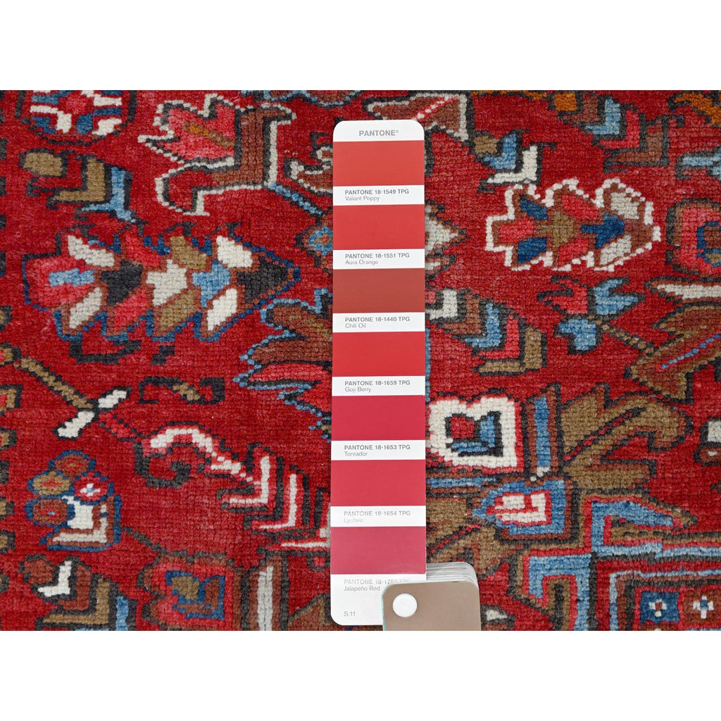8'2"x10'10" Tomato Tango Red, Central Geometric Medallion, Evenly Worn, Cleaned, Good Condition, Hand Knotted, Persian Heriz All Wool, Cropped Thin, Sides And Ends Secured Professionally, Vintage Oriental Rug FWR696