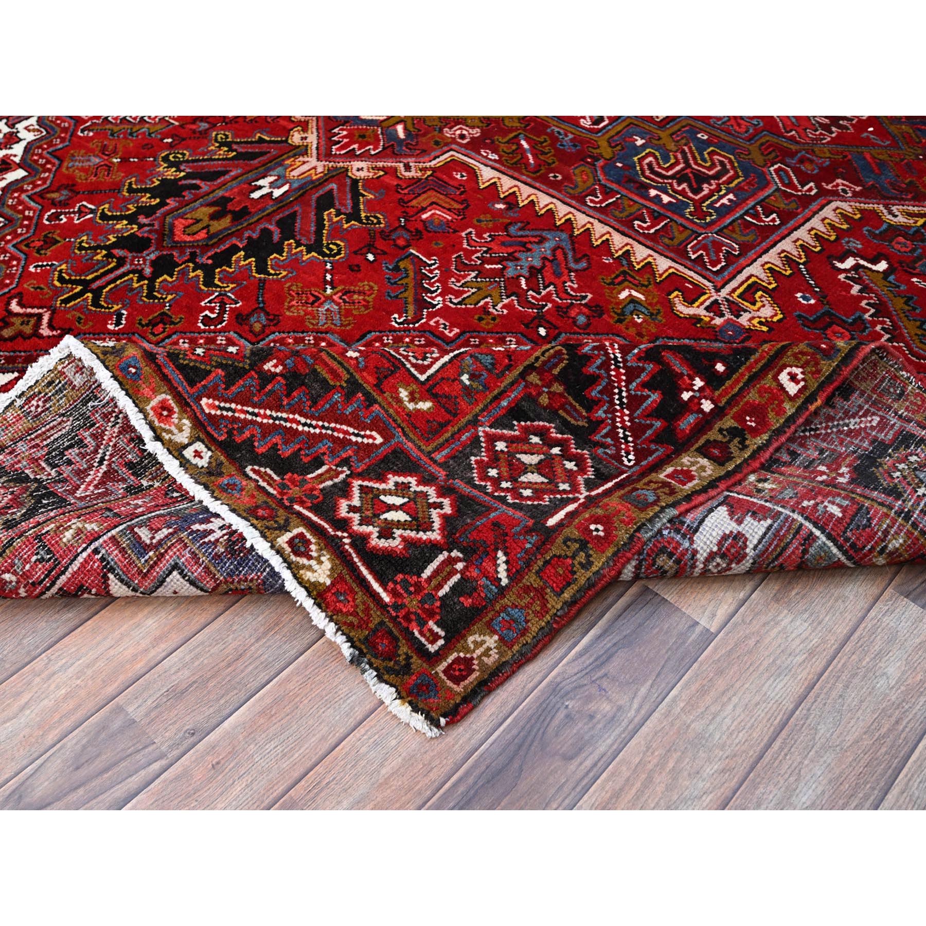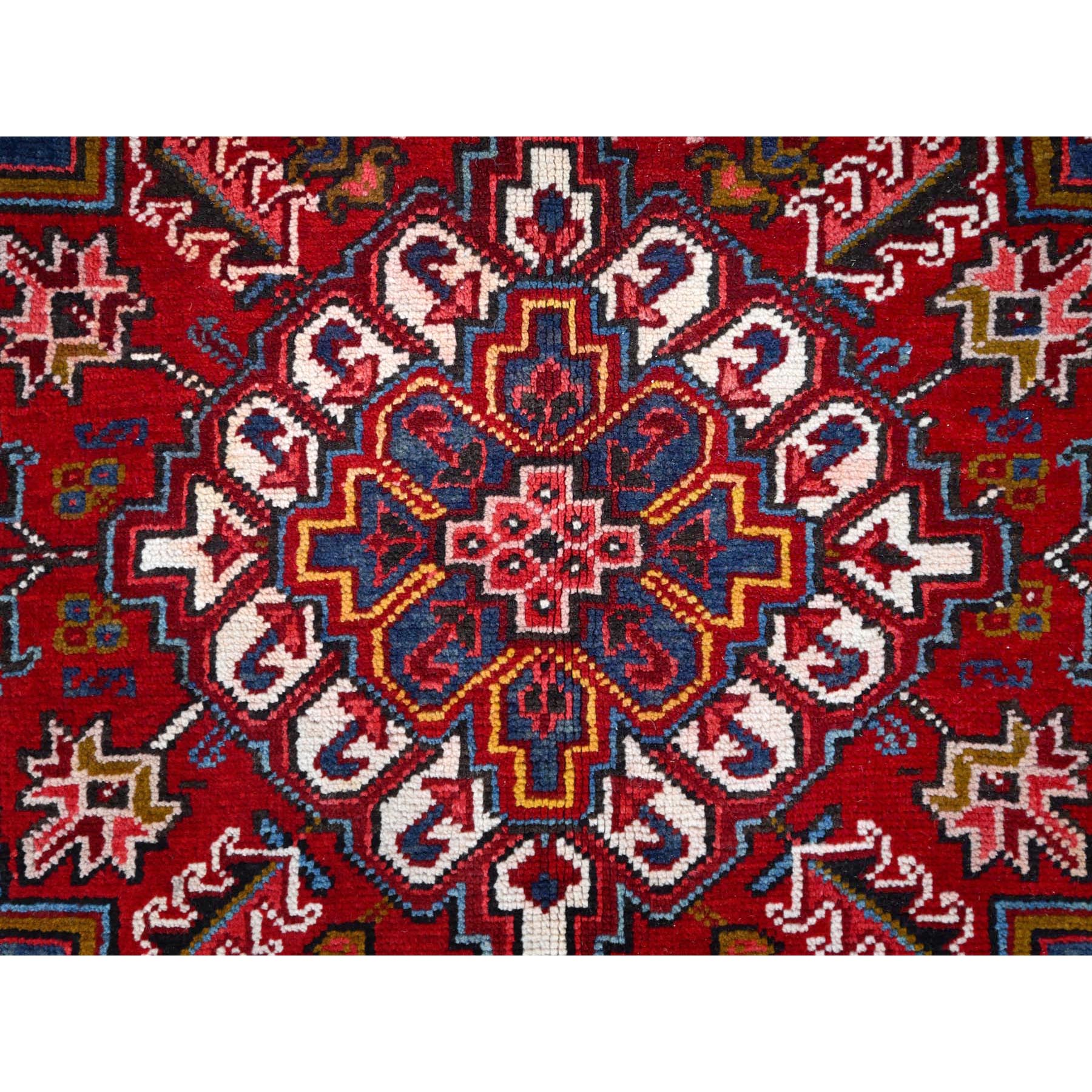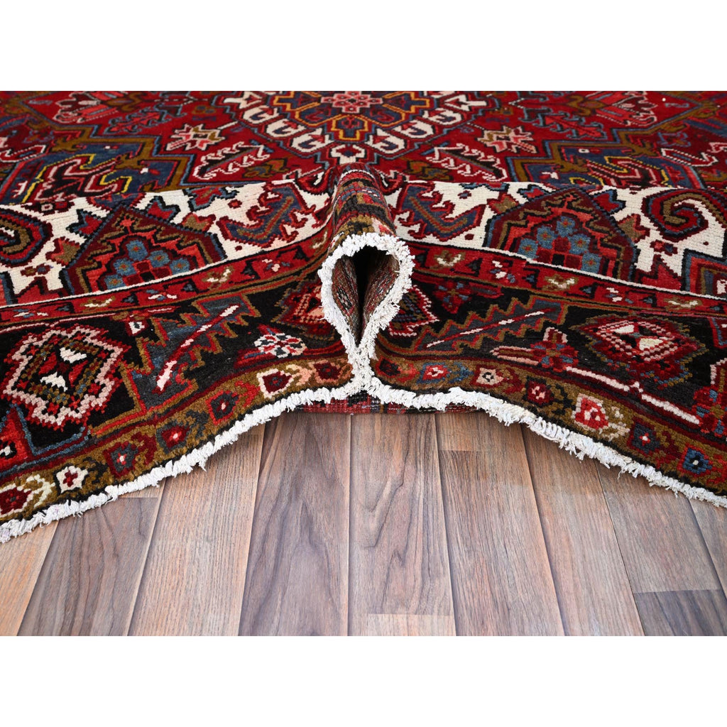 8'7'x11'1" Cherry Red, Tribal Village Nomad Art With Large Geometric Motif, Vibrant Wool, Hand Knotted, Ends And Sides Secured Professionally, Cleaned, Mint Condition, Vintage Persian Heriz Oriental Rug FWR666