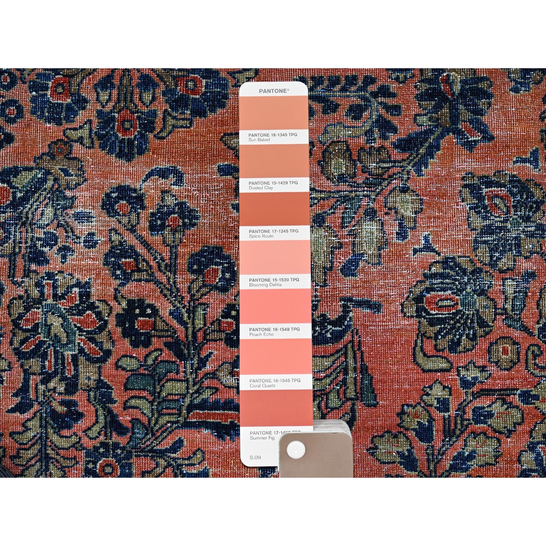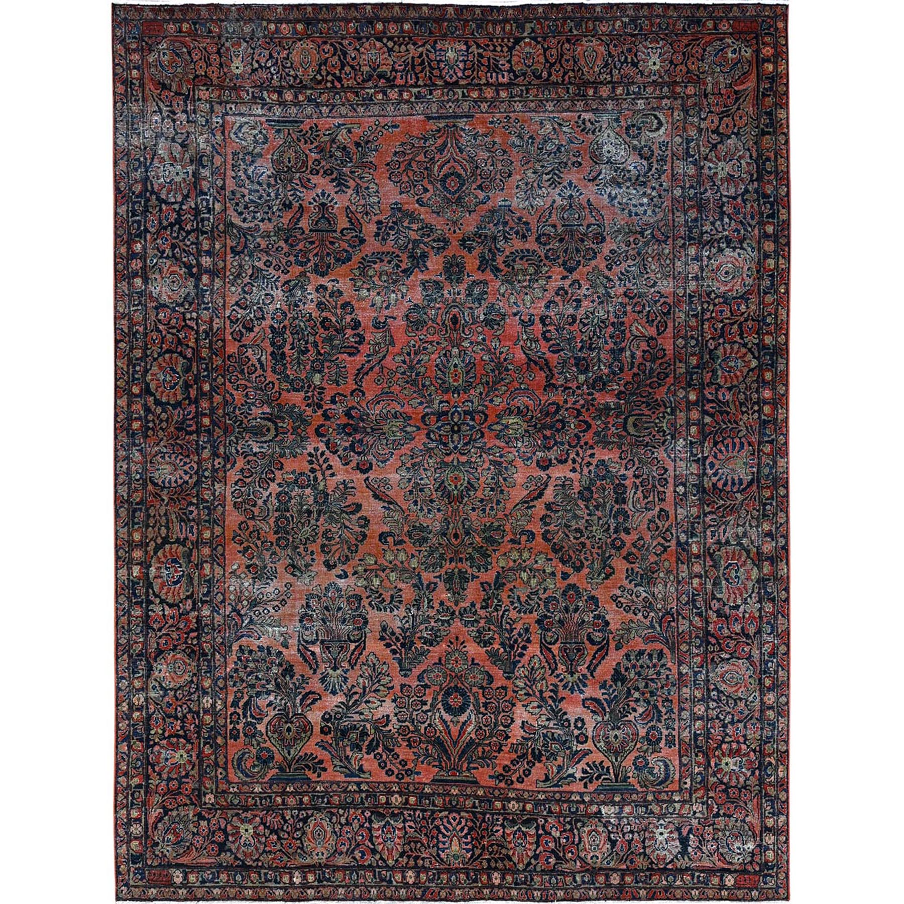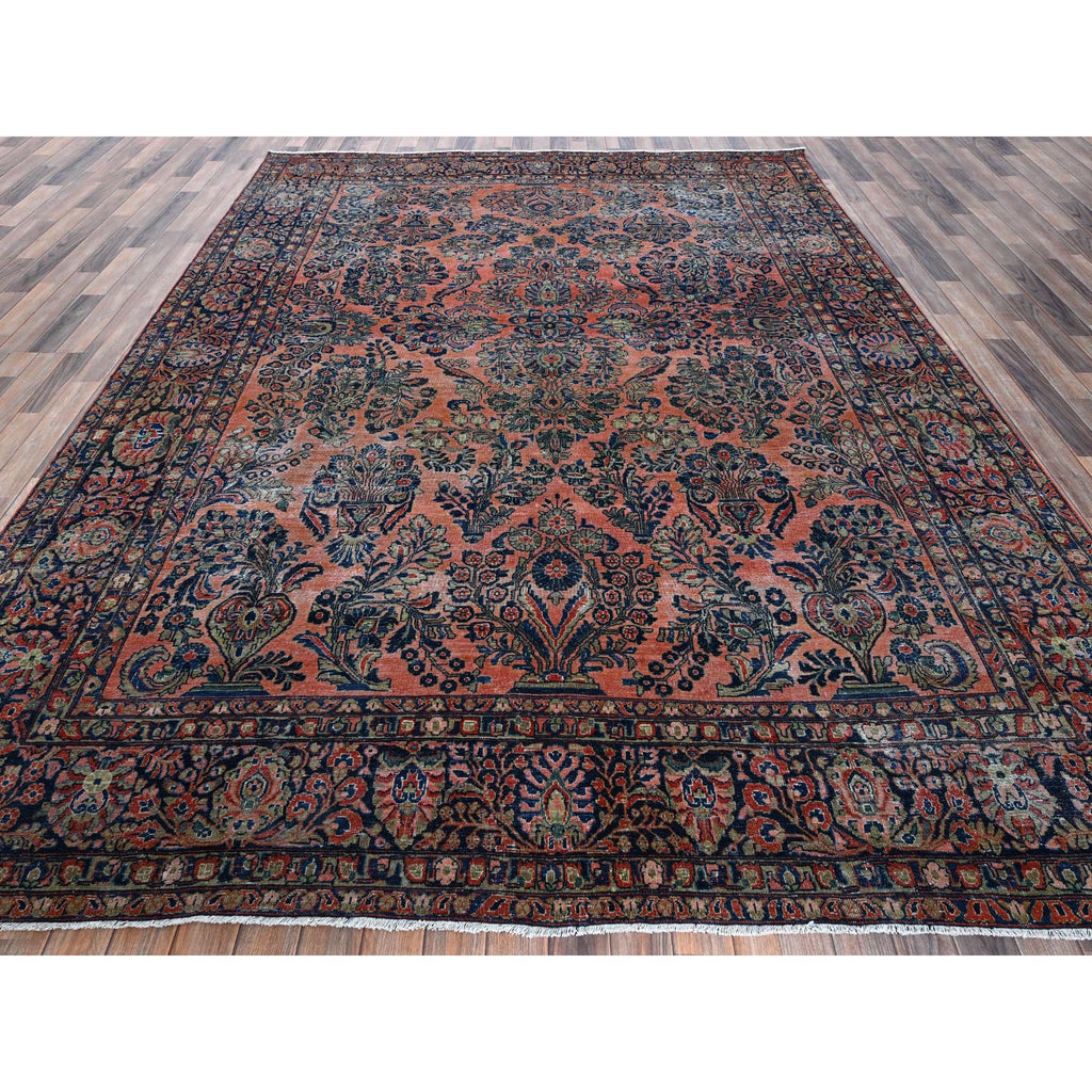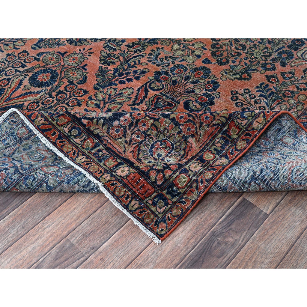 8'8"x11'6" Salmon Red, Antique Persian Sarouk, Washed And Shaved Low, Sides And Ends Professionally Secured, Shabby Chic, Distressed, Zero Pile, Hand Knotted, Pure Wool, Oriental Rug FWR8202