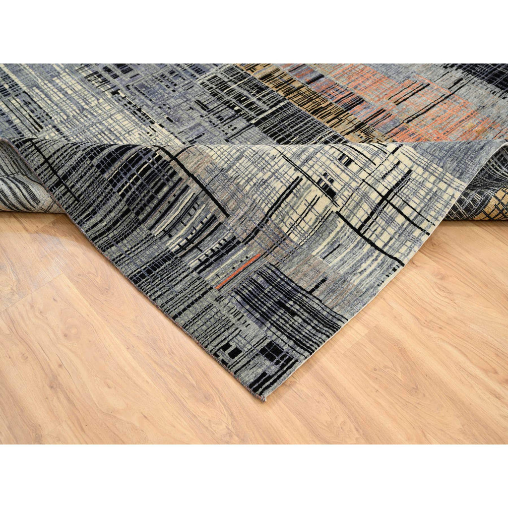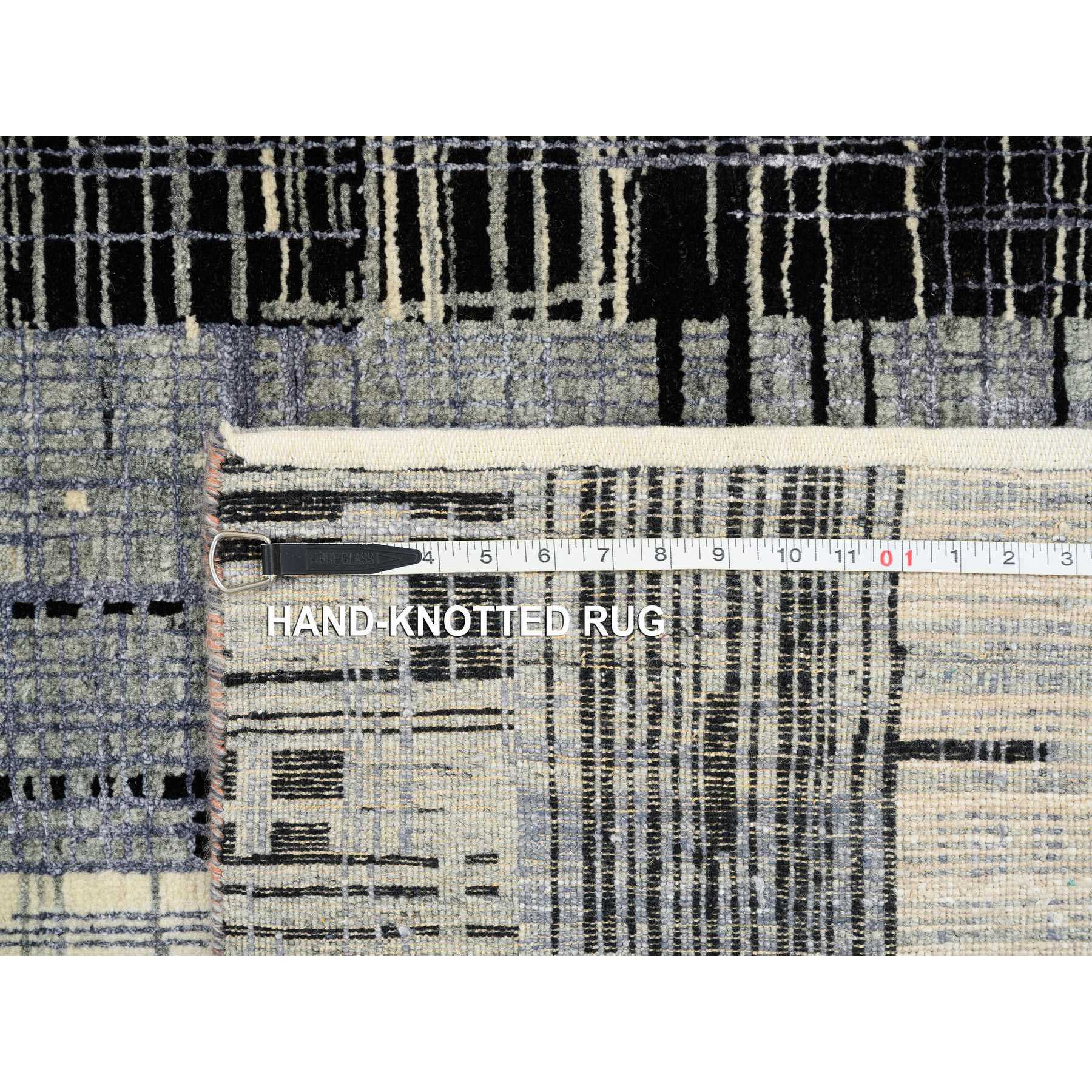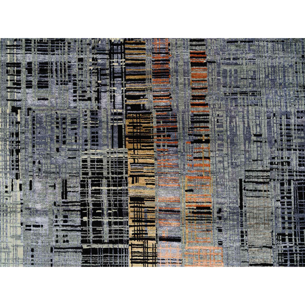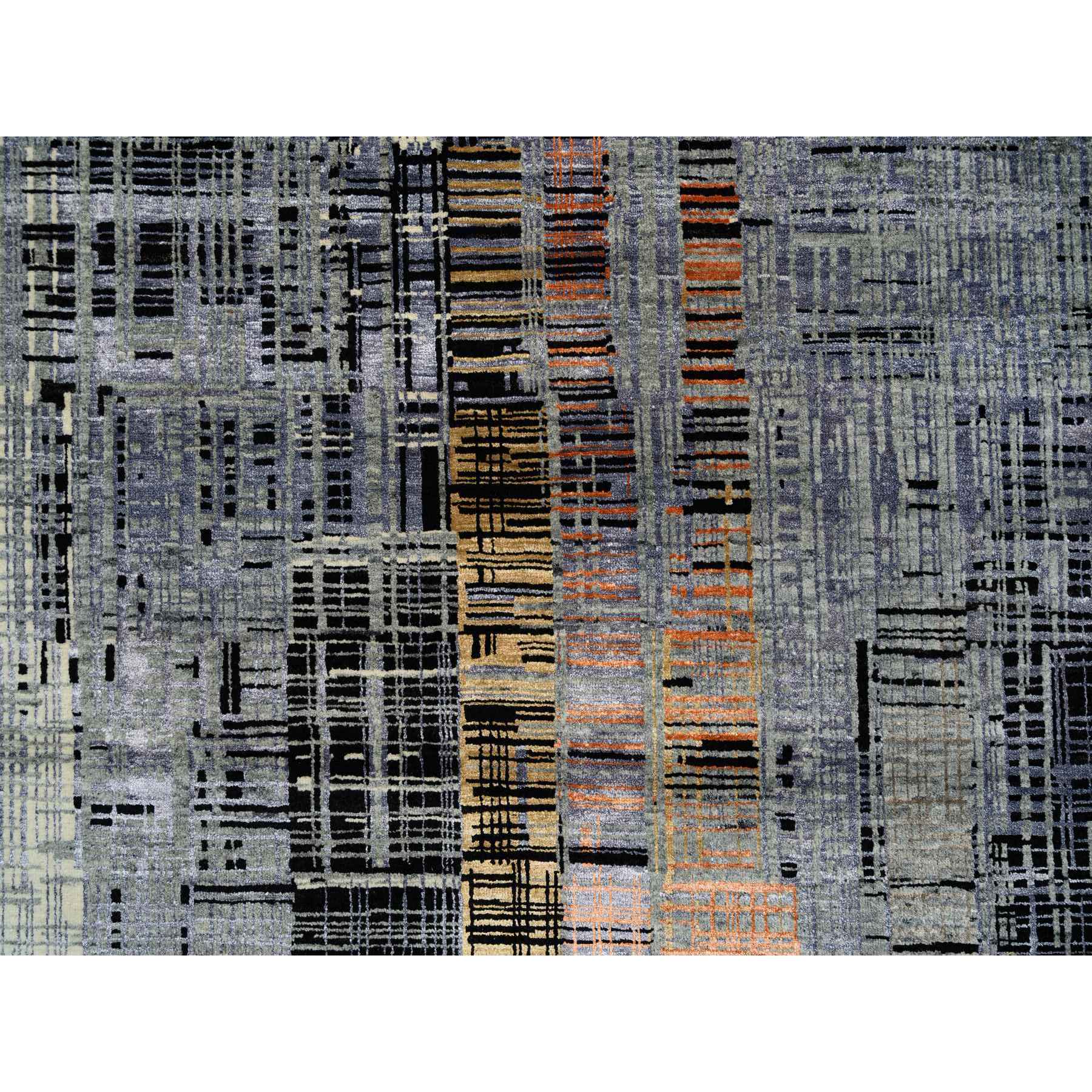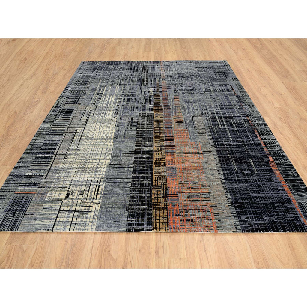 8'x10' Black And Gray, Ghazni Wool And Silk Modern Colorful Stripe Design, Hand Knotted, Oriental Rug FWR389202