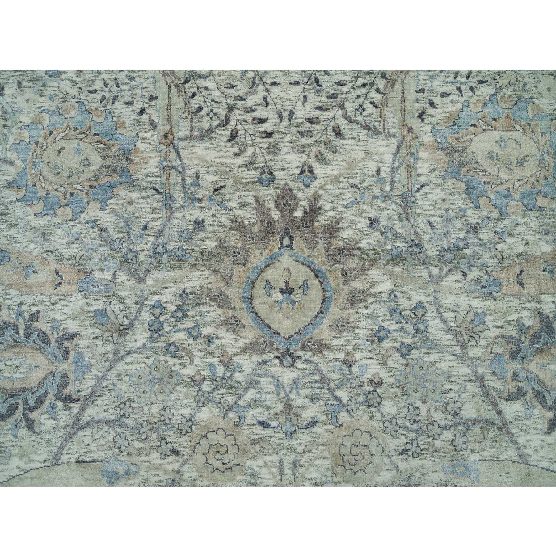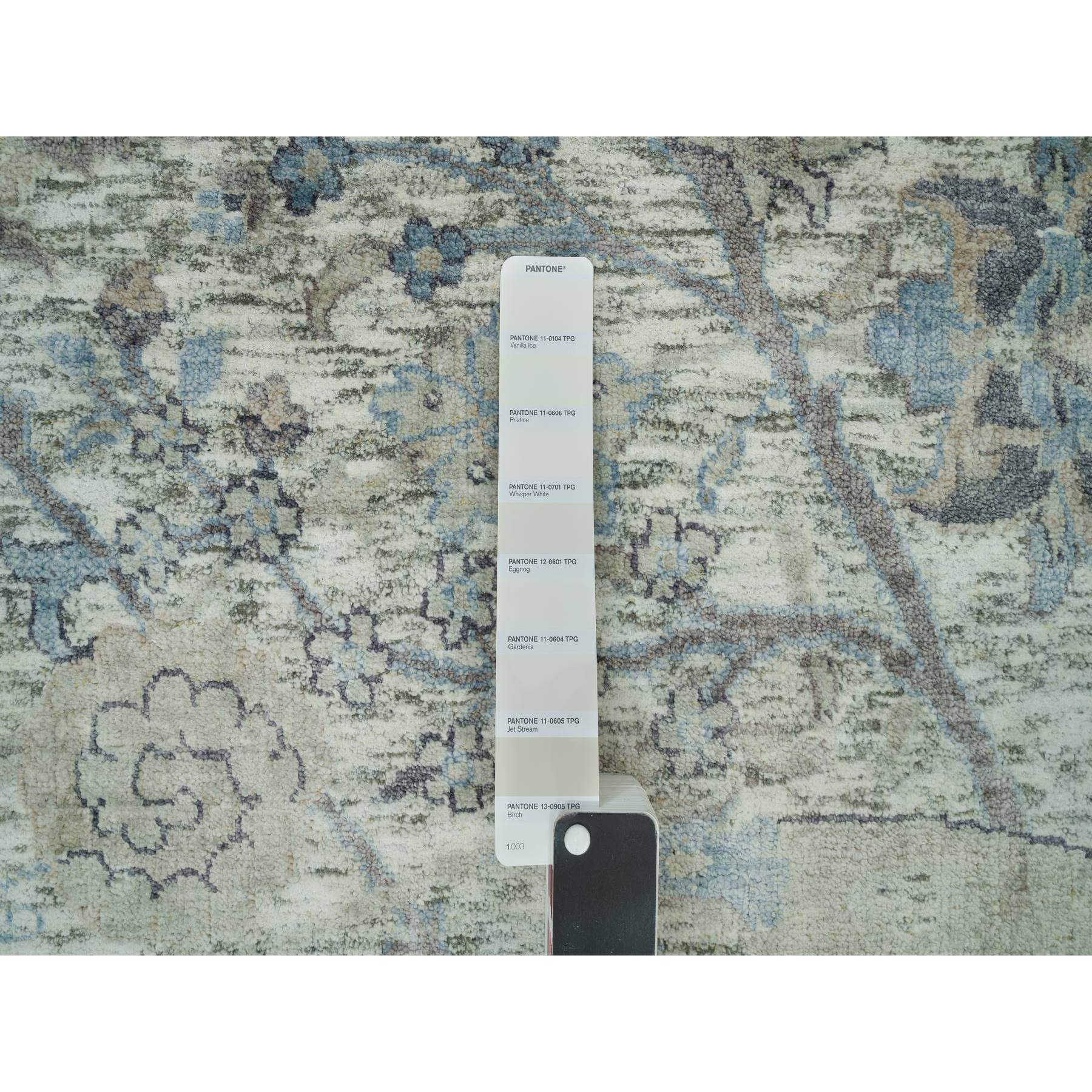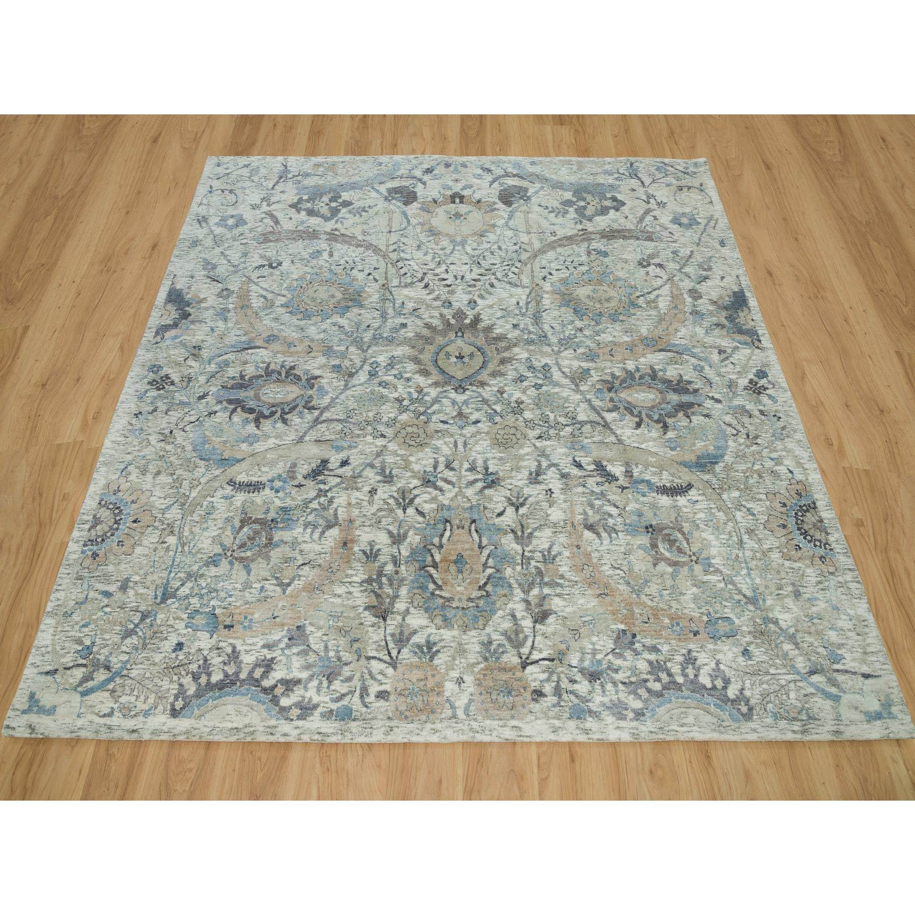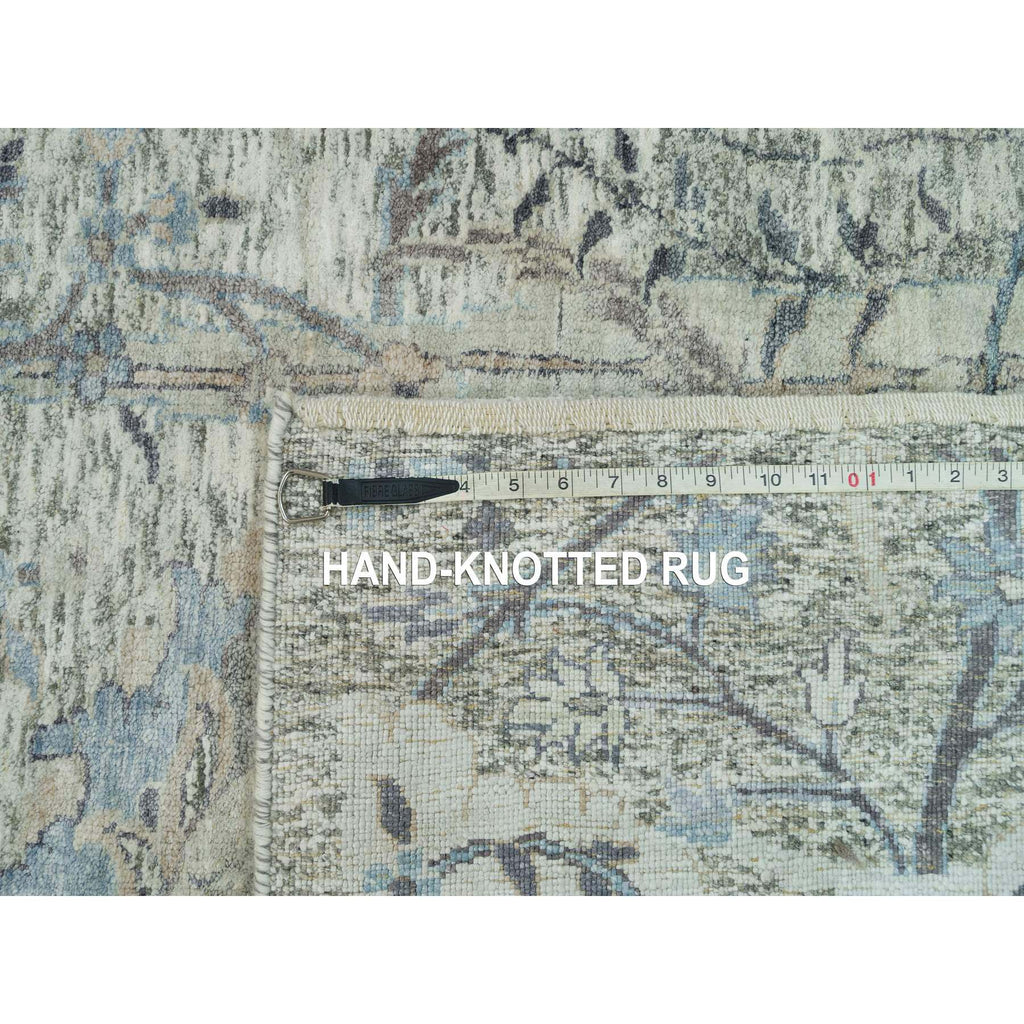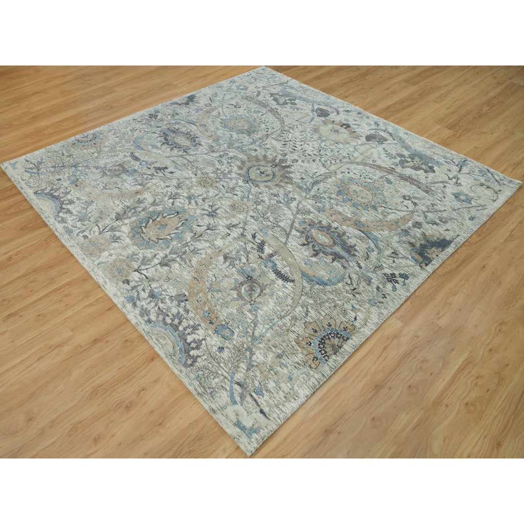 8'x8' Delicate White, Sickle Leaf Hand Knotted Soft Pile Design, Silk With Textured Wool, Square Oriental Rug FWR541356