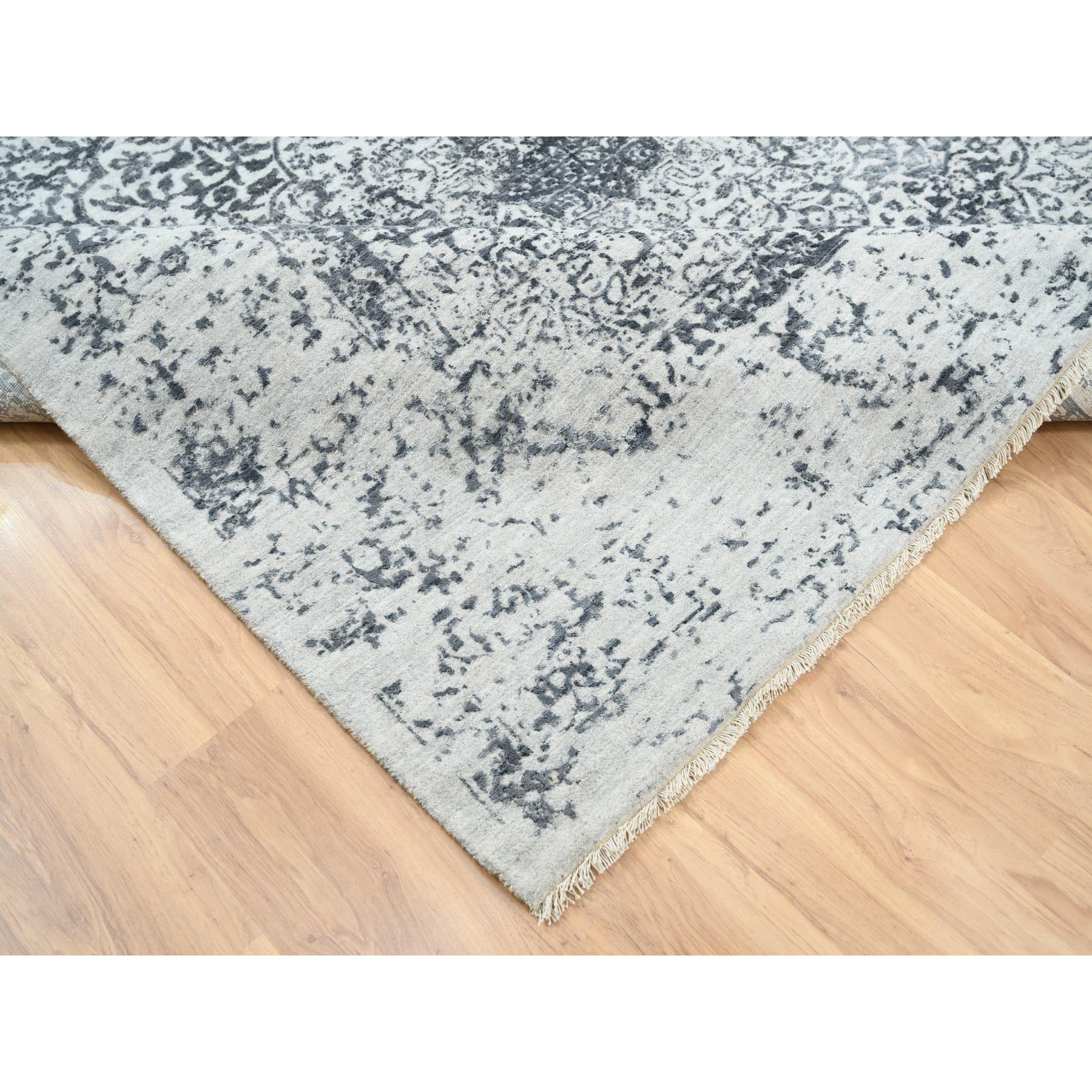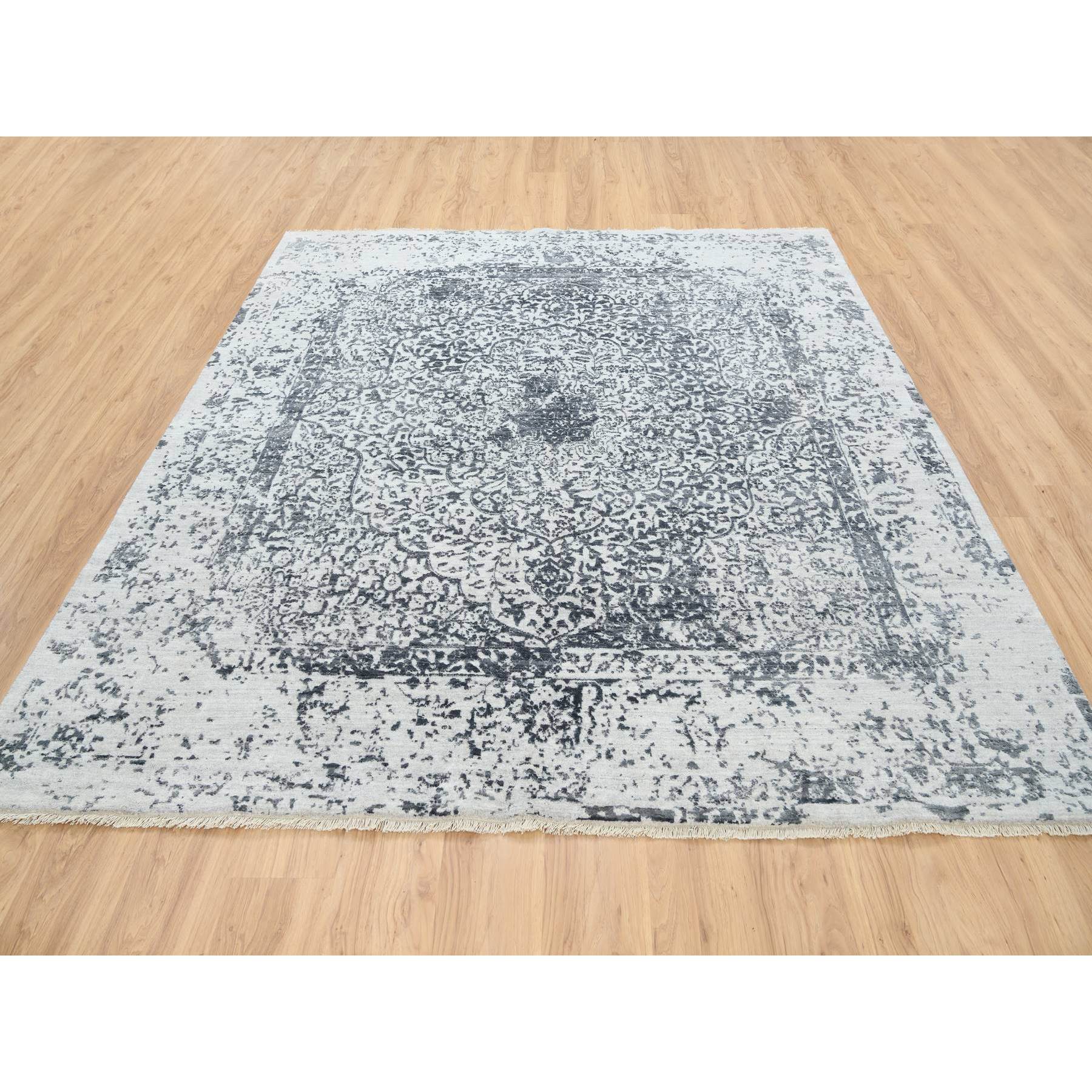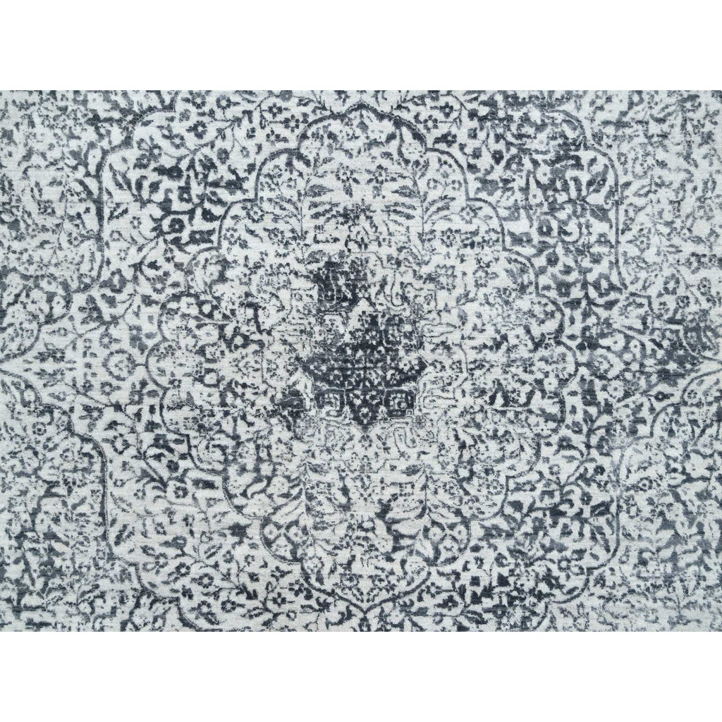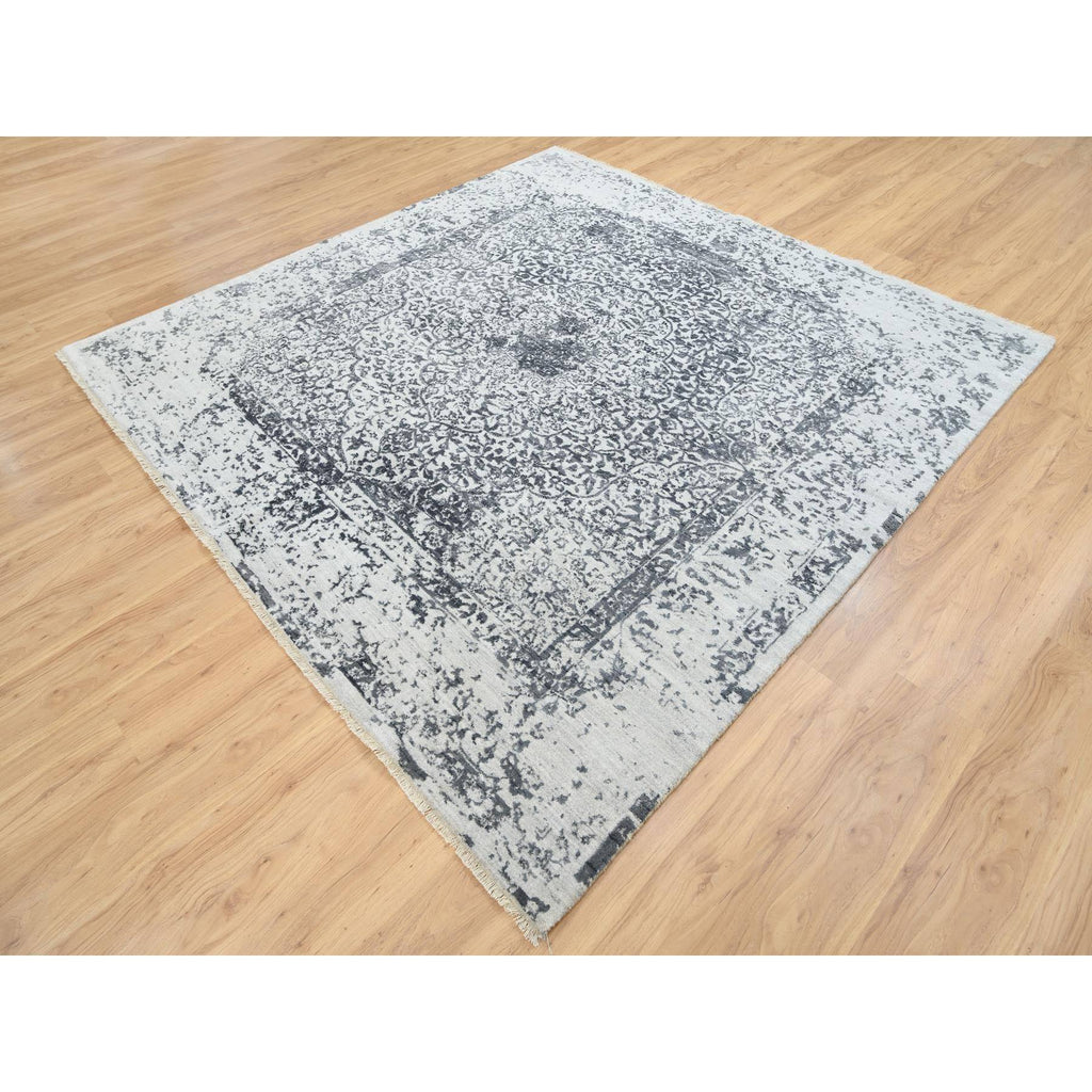 8'x8' Hand Knotted Silver Gray Erased Persian Design Wool And Pure Silk Oriental Square Rug FWR380730
