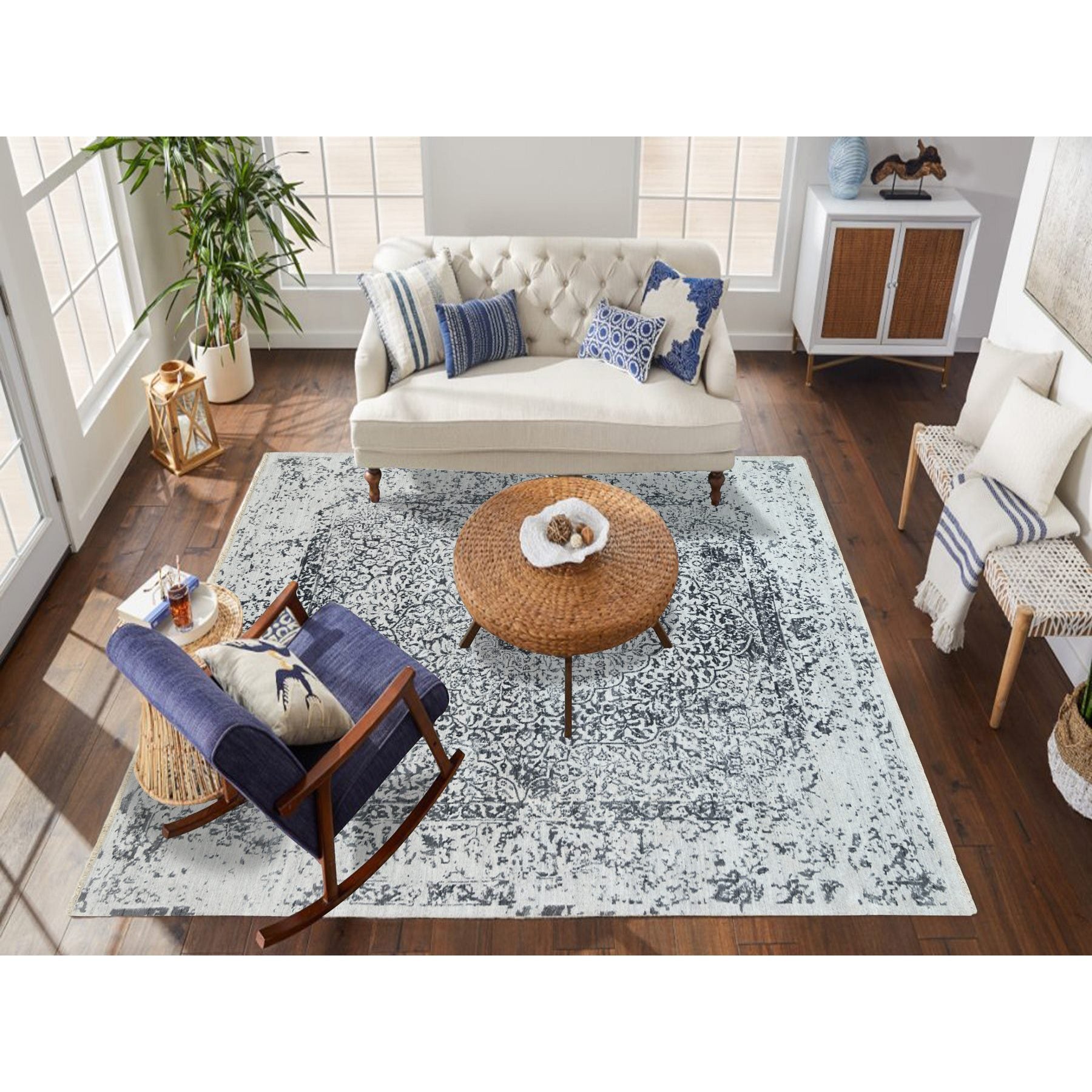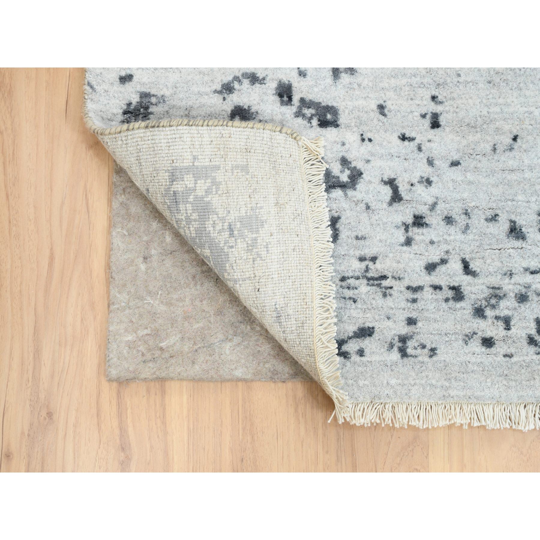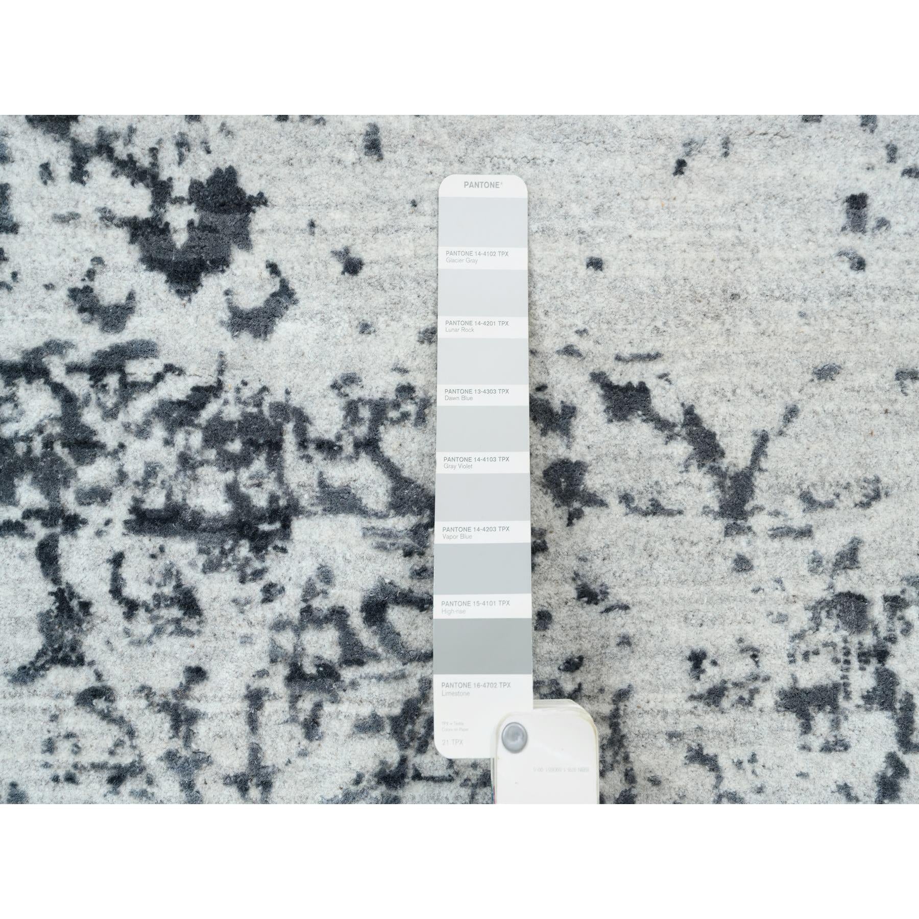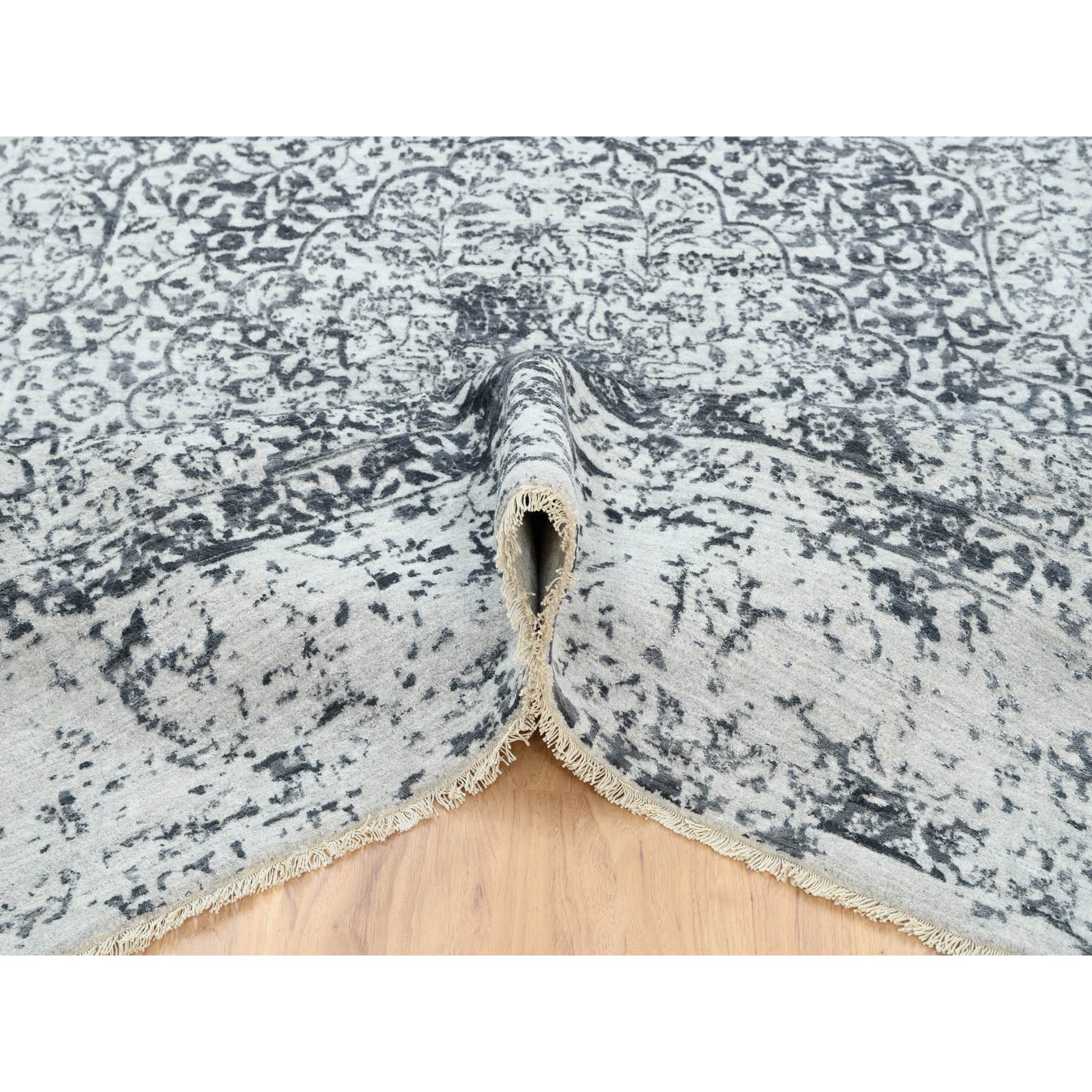 8'x8' Hand Knotted Silver Gray Erased Persian Design Wool And Pure Silk Oriental Square Rug FWR380730