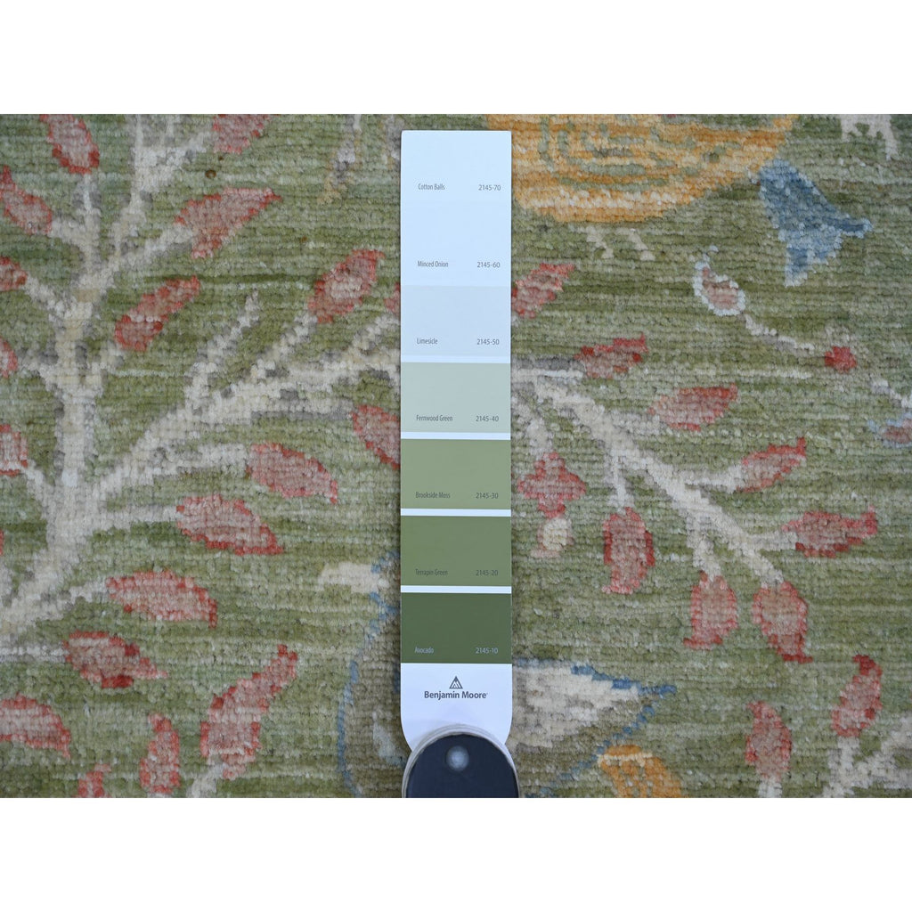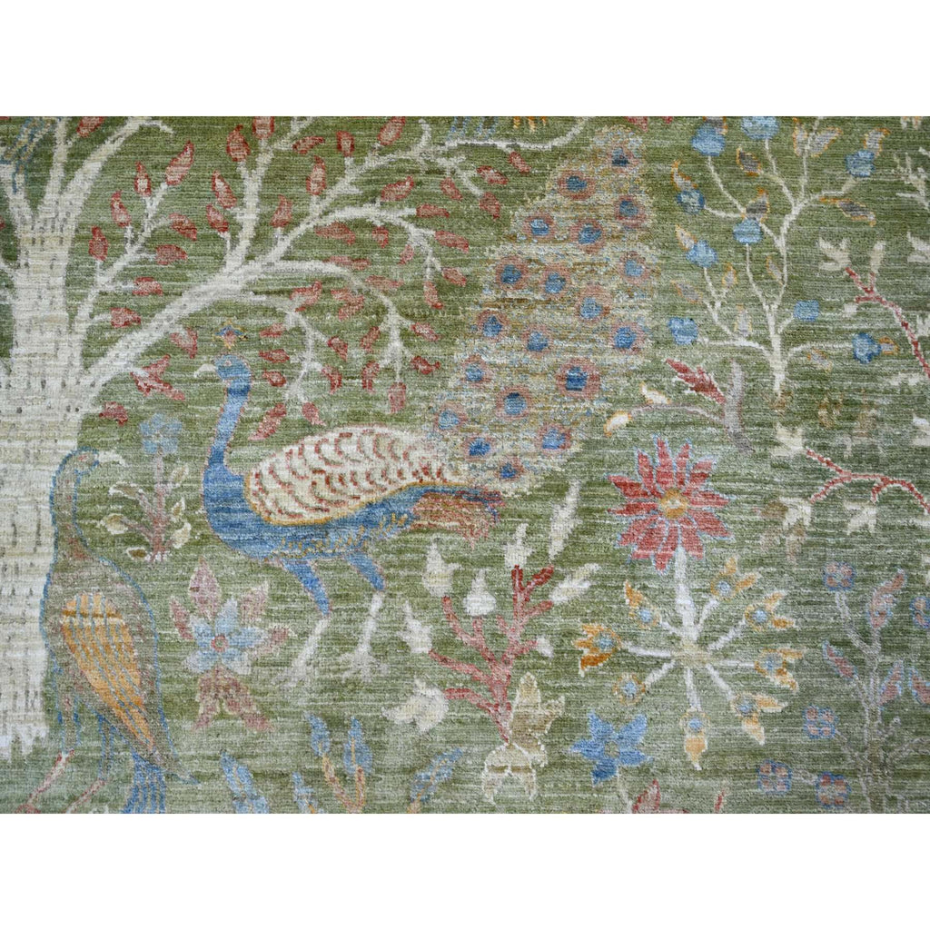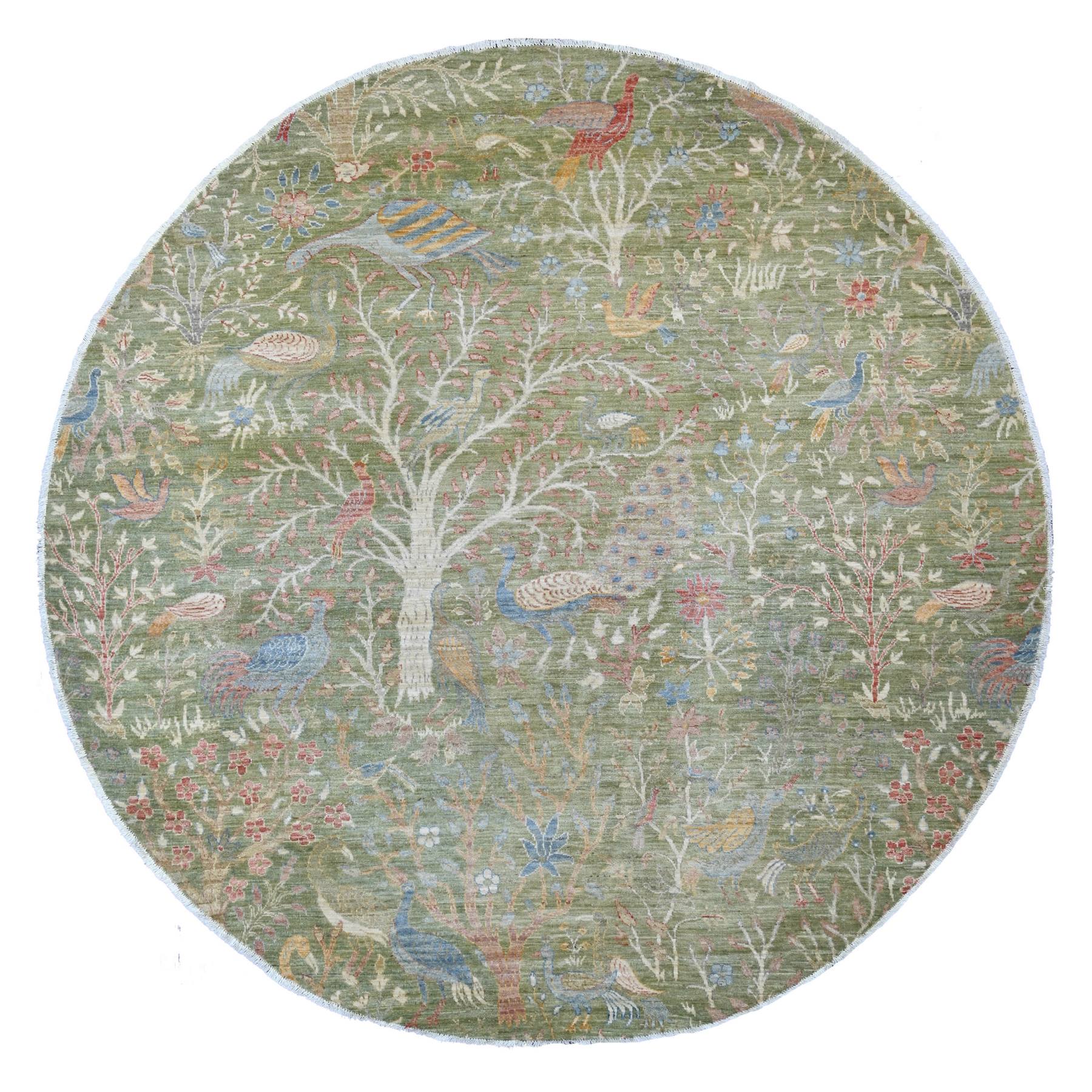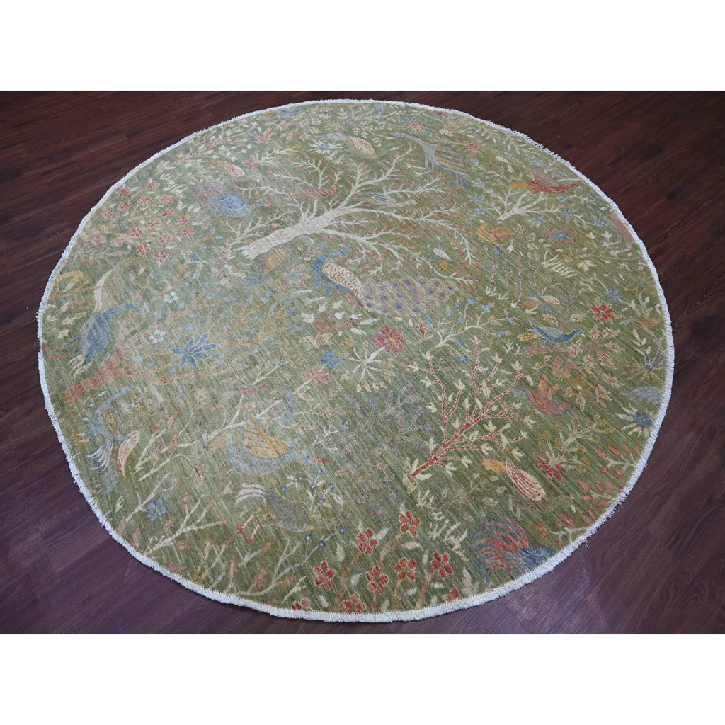 8'x8' Pickle Green, Afghan Peshawar With Colorful Birds Of Paradise Design, Hand Knotted, Pure Wool, Natural Dyes, Round, Oriental Rug FWR126654