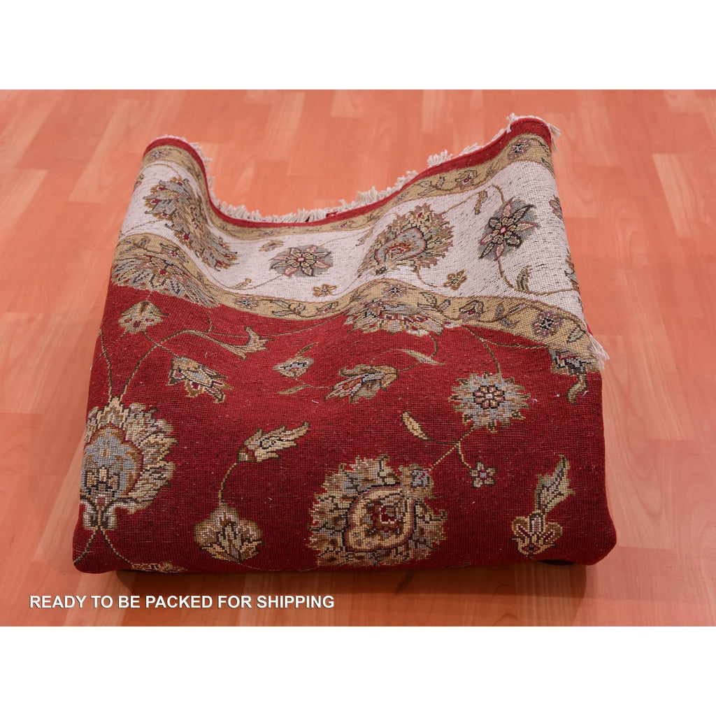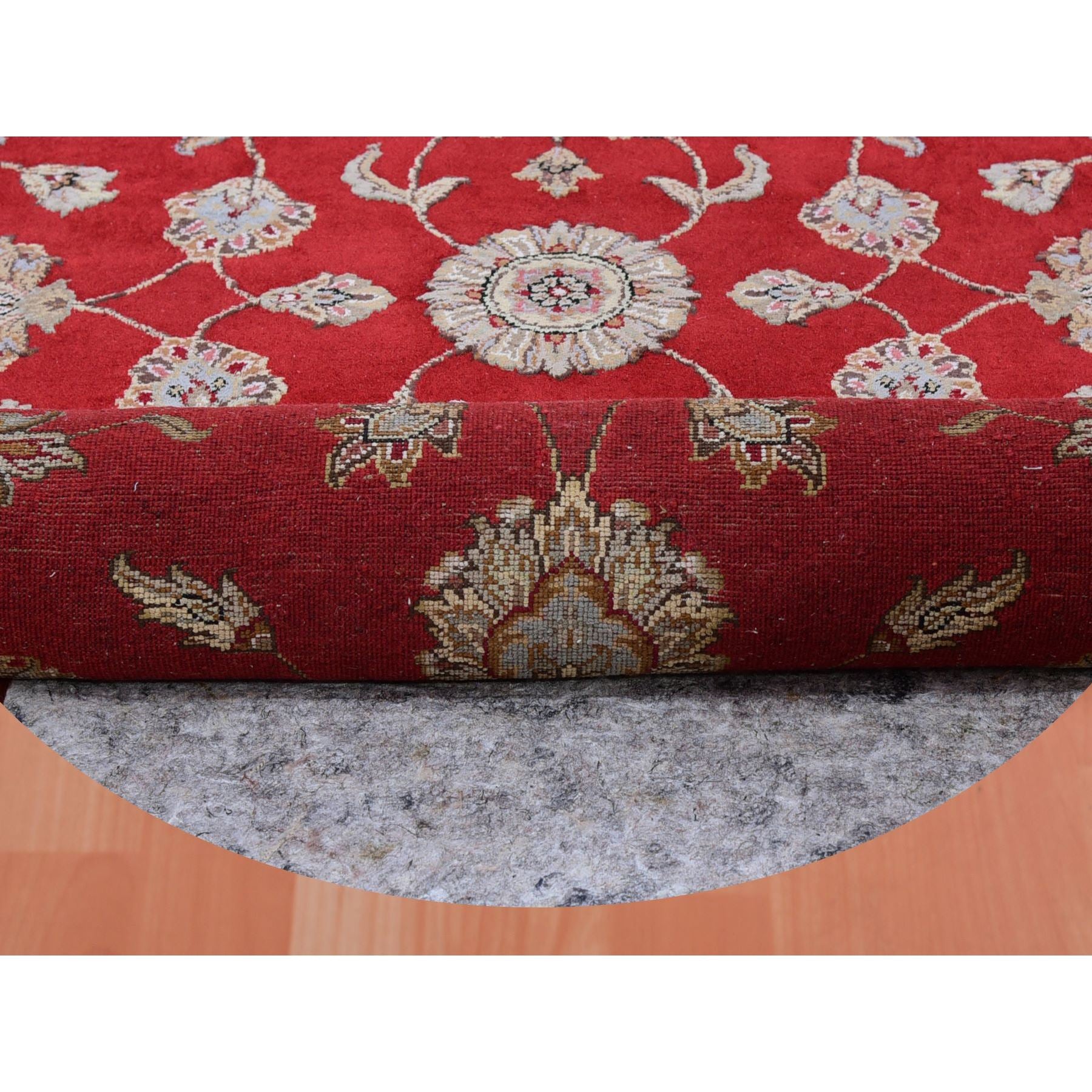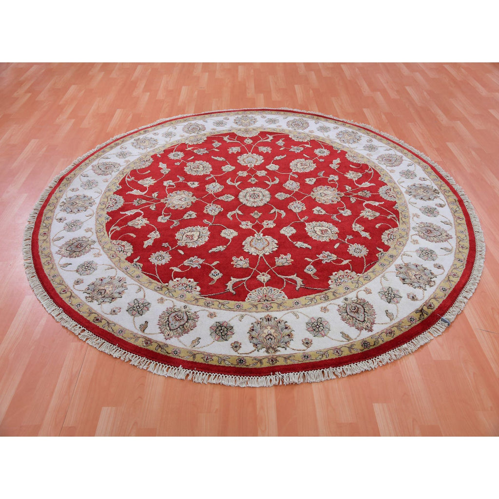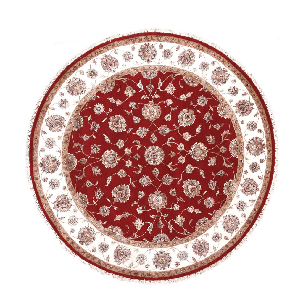8'x8' Red Dahlia And Chantilly Lace White, Wool And Silk, Hand Knotted, Rajasthan Design, Thick And Plush, All Over Leaf Pattern, Oriental Round Rug FWR452124