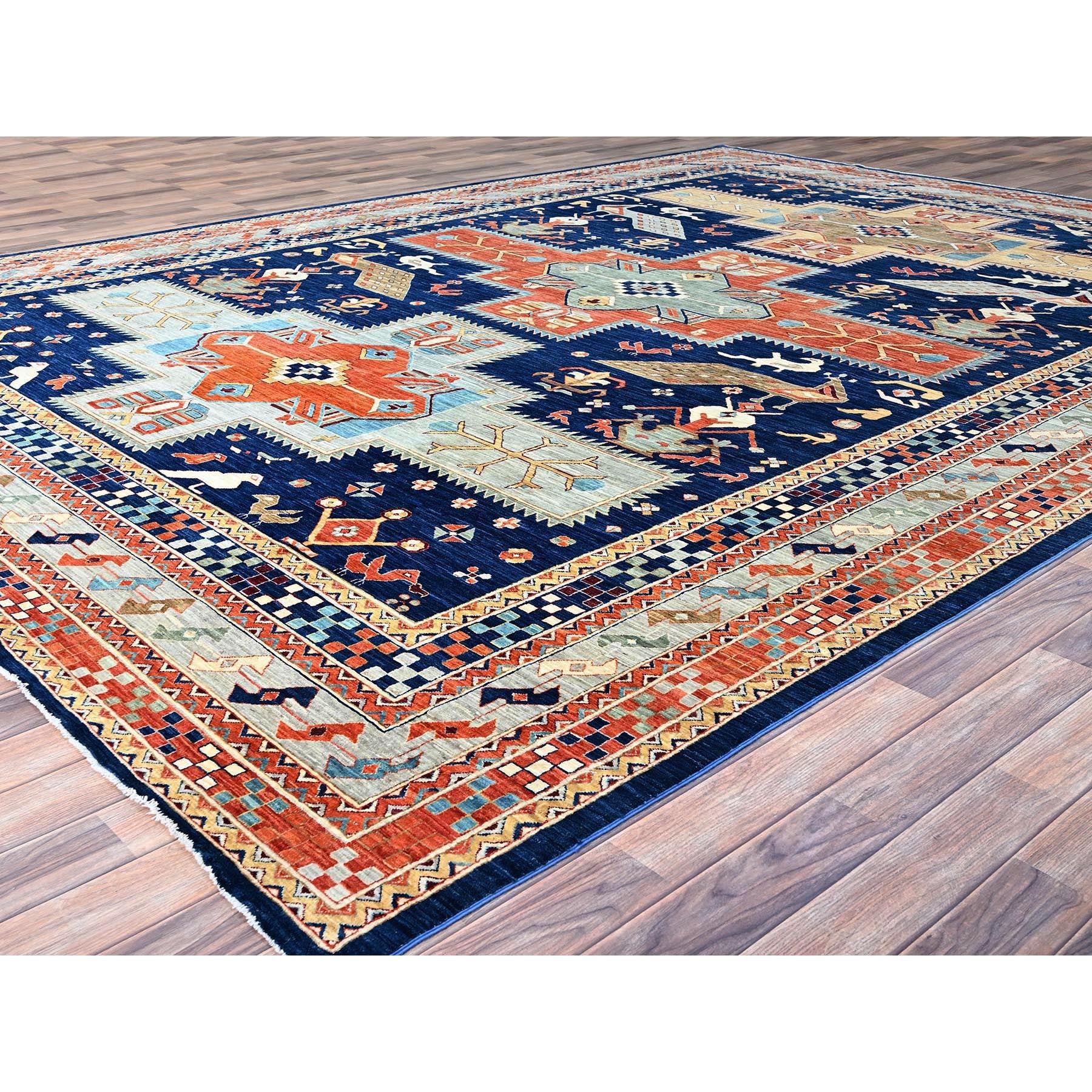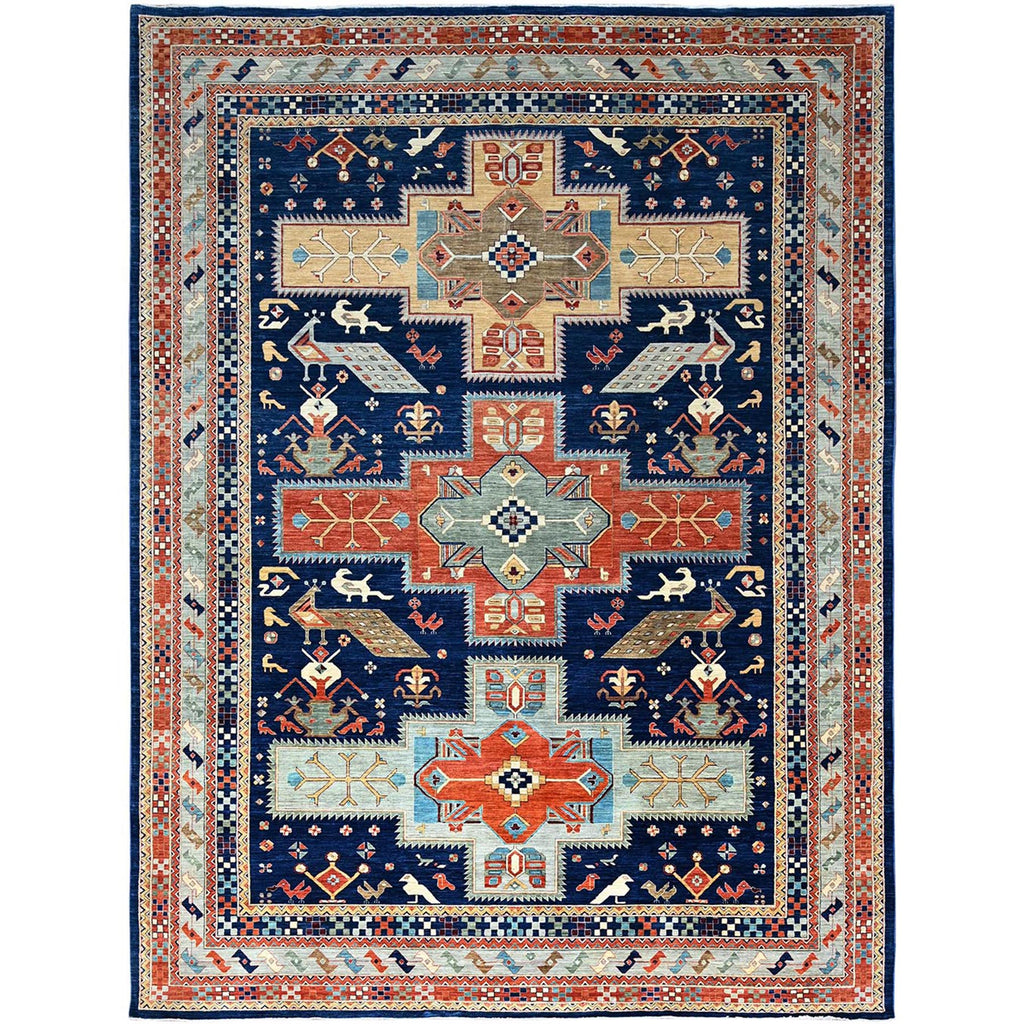 9'10"x13'7" Astros Navy Blue, Armenian Inspired Caucasian Design, 200 Kpsi, Hand Knotted With Small Bird Figurines, Velvety Wool, Densely Woven Vegetable Dyes Oriental Rug FWR864