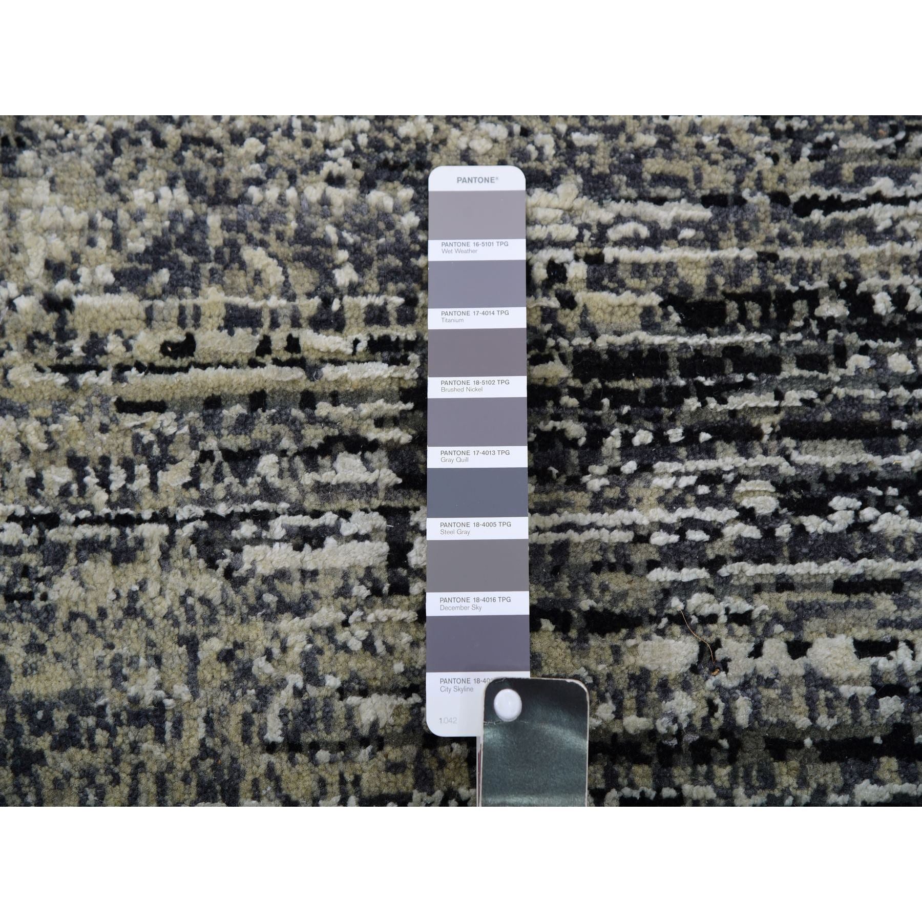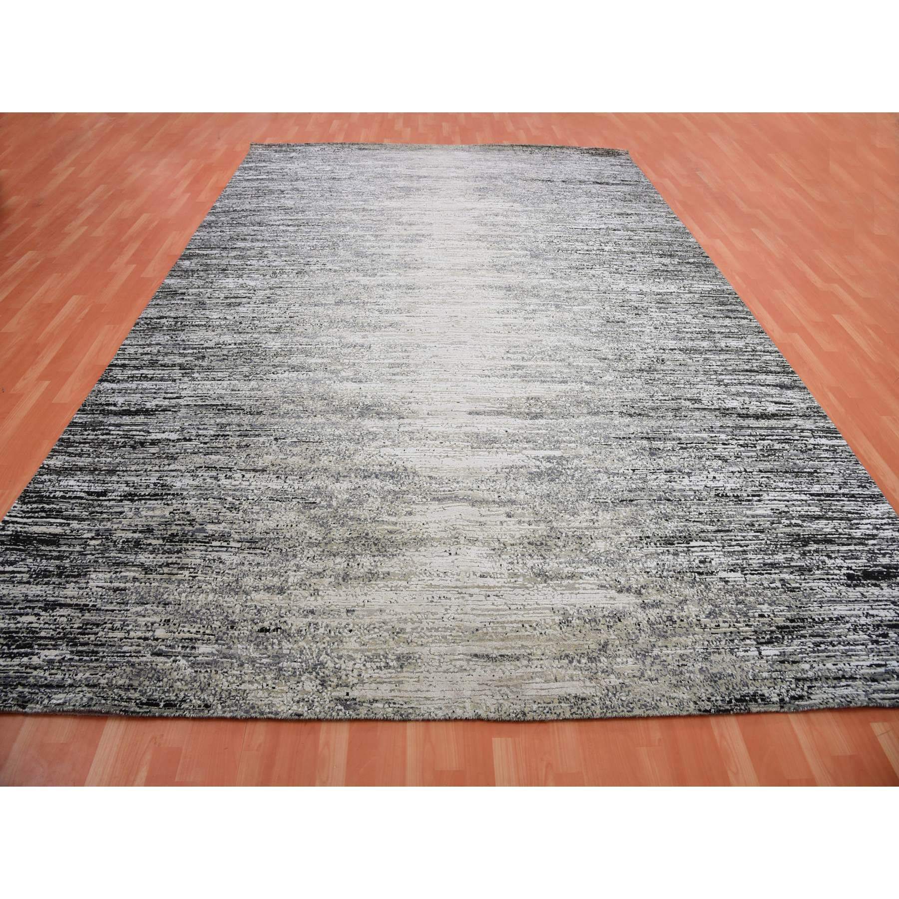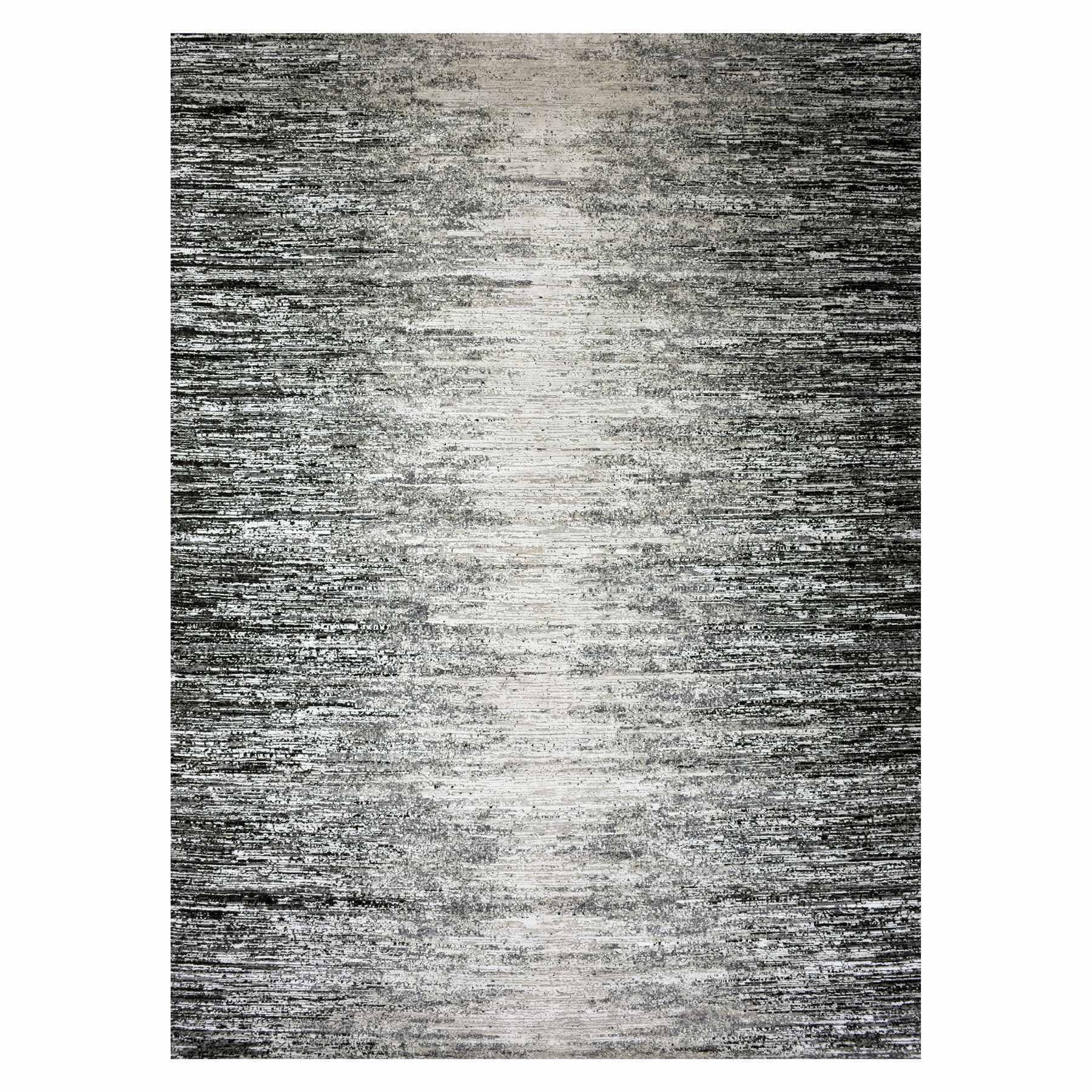 9'10"x14' Caviar Black With Mix Of Gray, Hand Knotted, Modern Striae Design, Soft Colors Wool And Silk Oriental Rug FWR452010