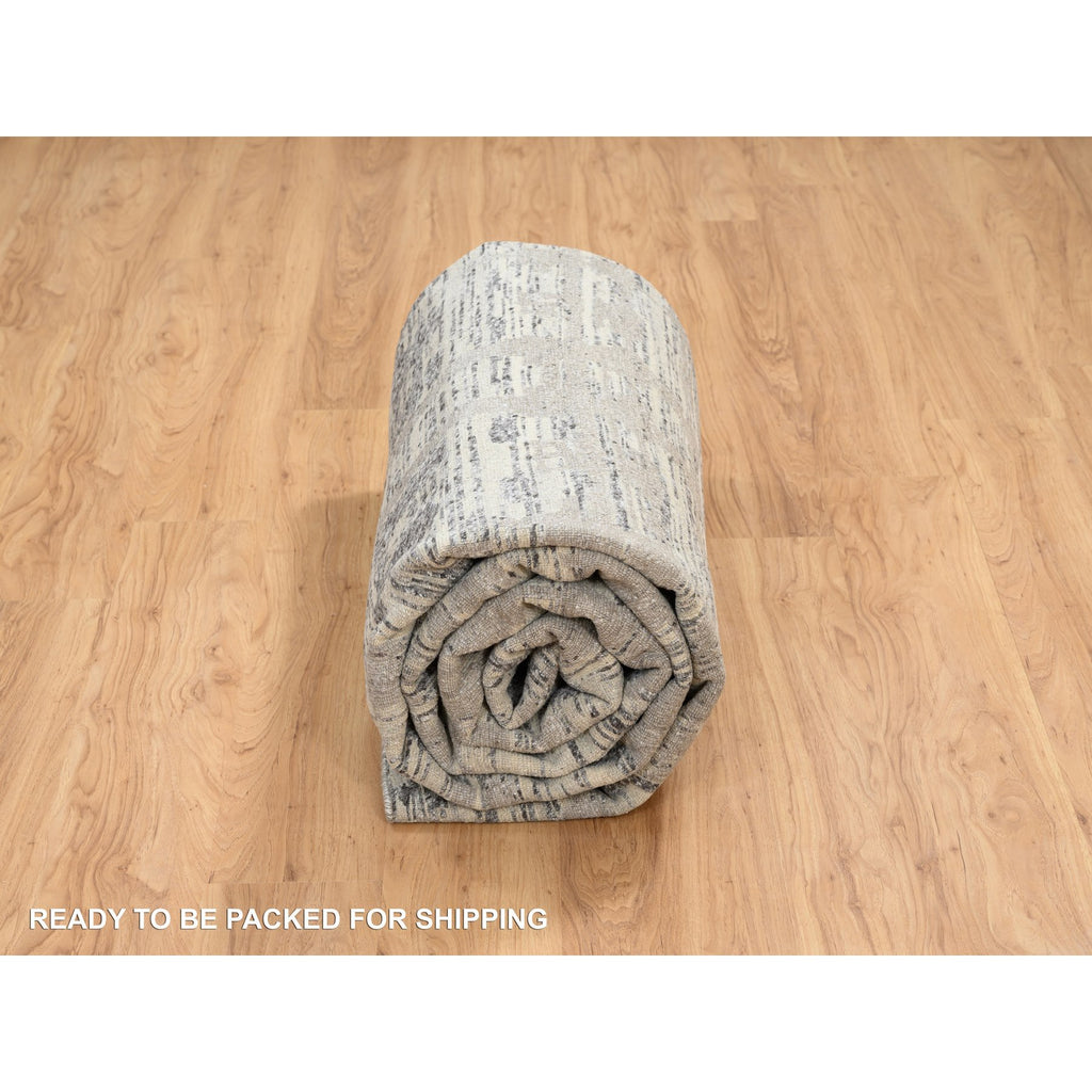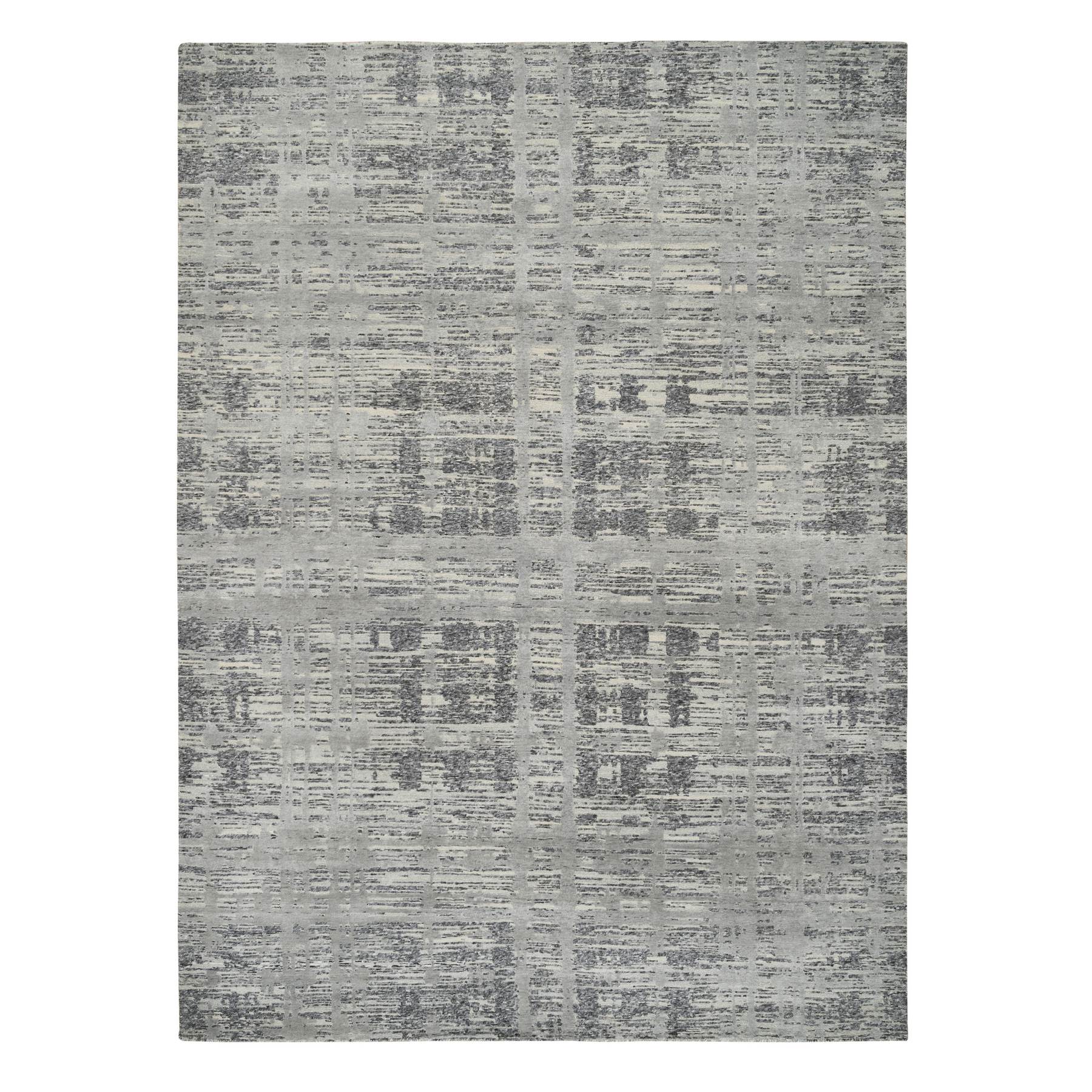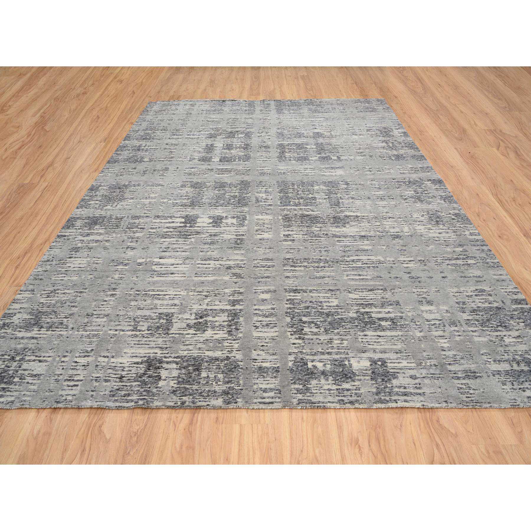 9'2"x11'10" Light Gray, Modern Criss Cross Erased Design, Hand Spun Undyed Natural Wool, Hand Knotted, Oriental Rug FWR388224