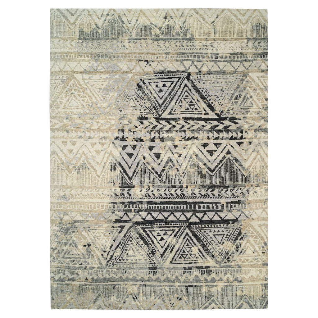 9'9"x13'10" Gray, Supple Collection Erased Ethnic Geometric Design, Pure Wool Thick And Plush Hand Knotted, Oriental Rug FWR383526